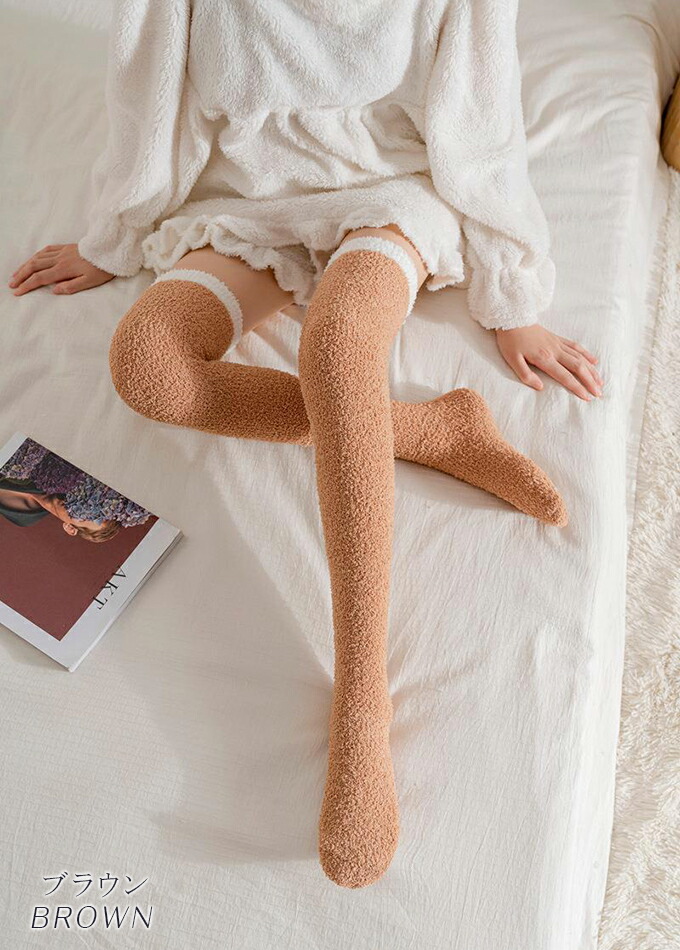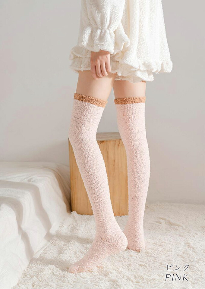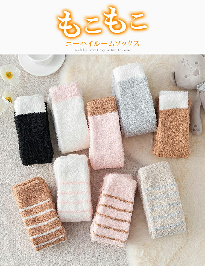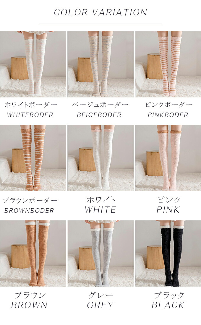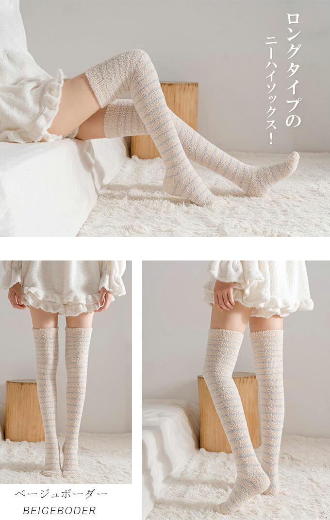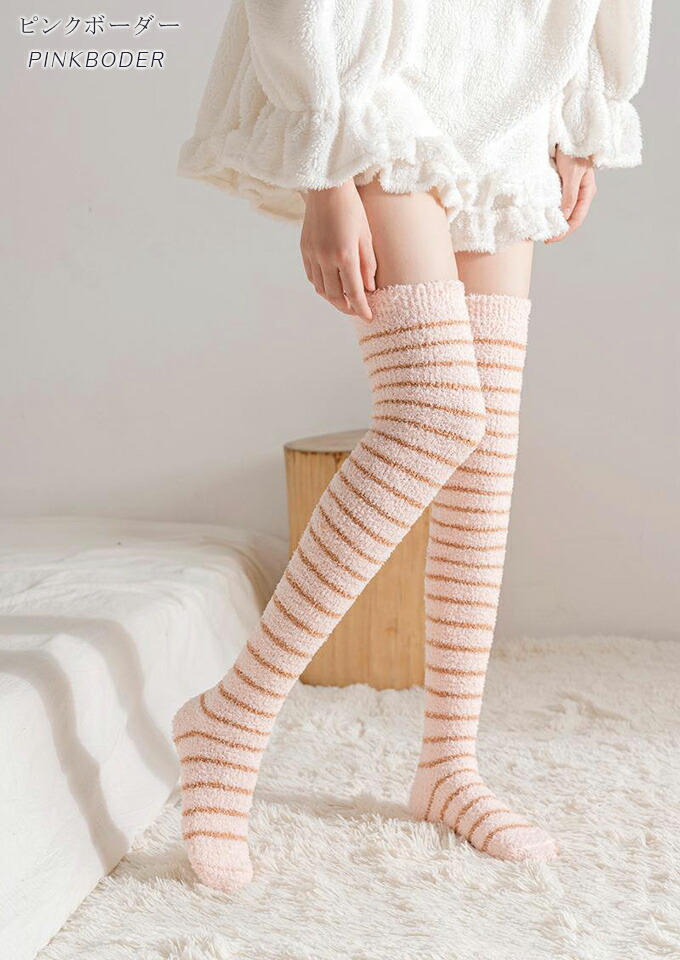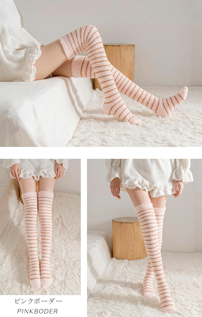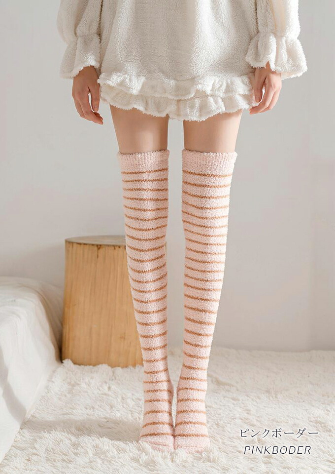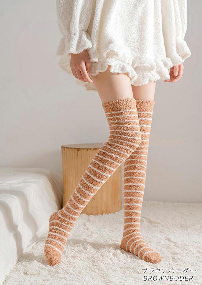 もこもこニーハイソックス ルームソック インナー 下着 ナイトウエア 人気 ブラック ピンク ホワイト ブラウン グレー ピンクボーダー ベージュボーダー ホワイトボーダー ブラウンボーダー