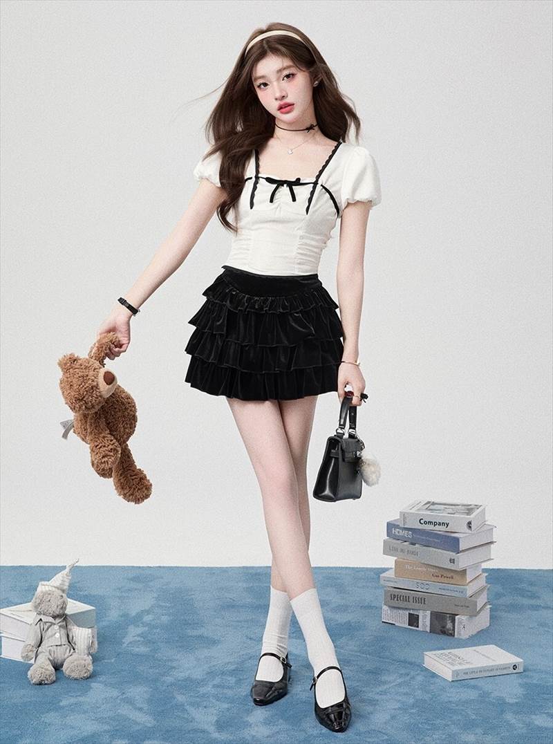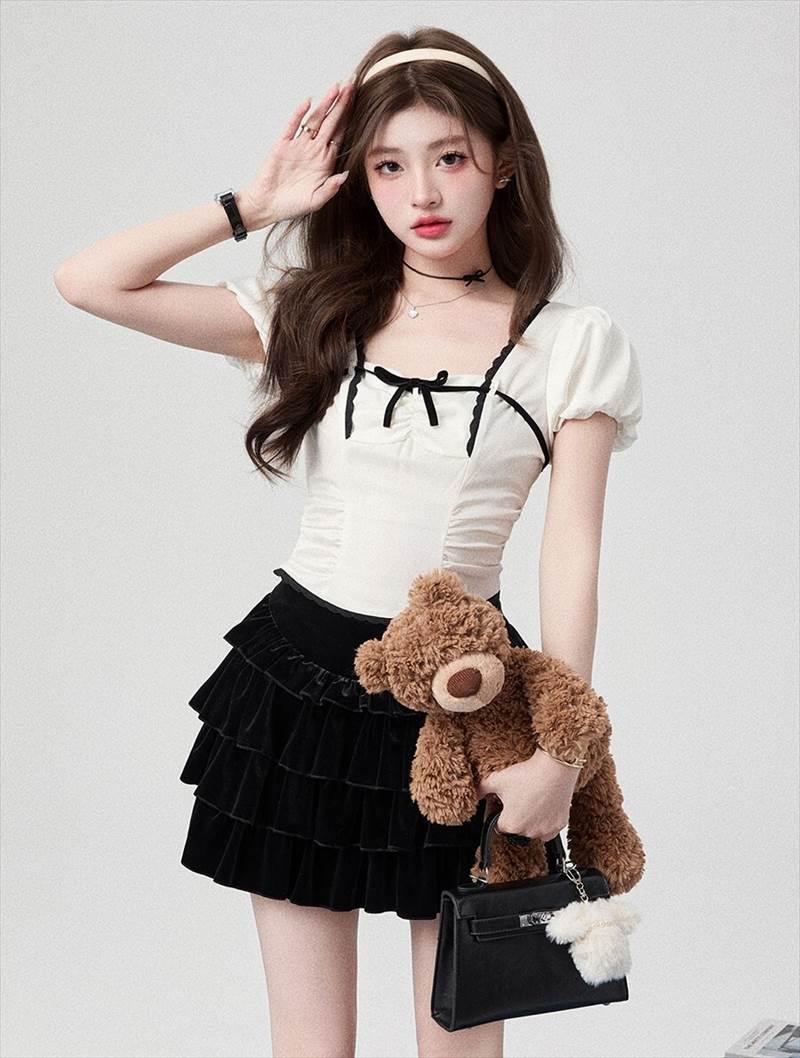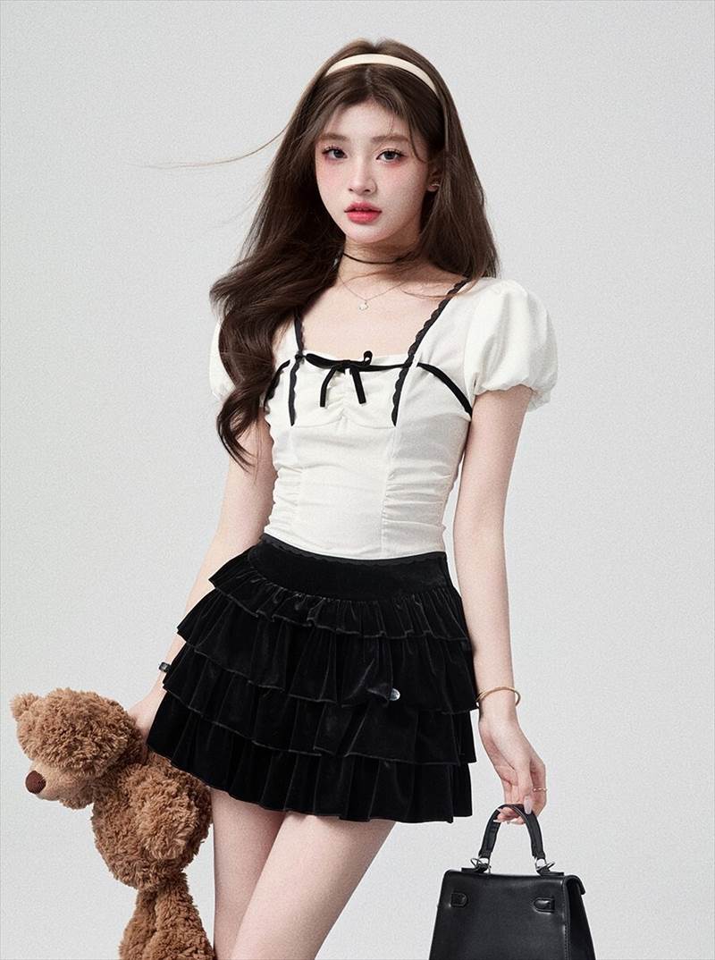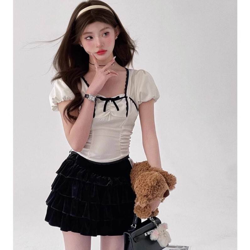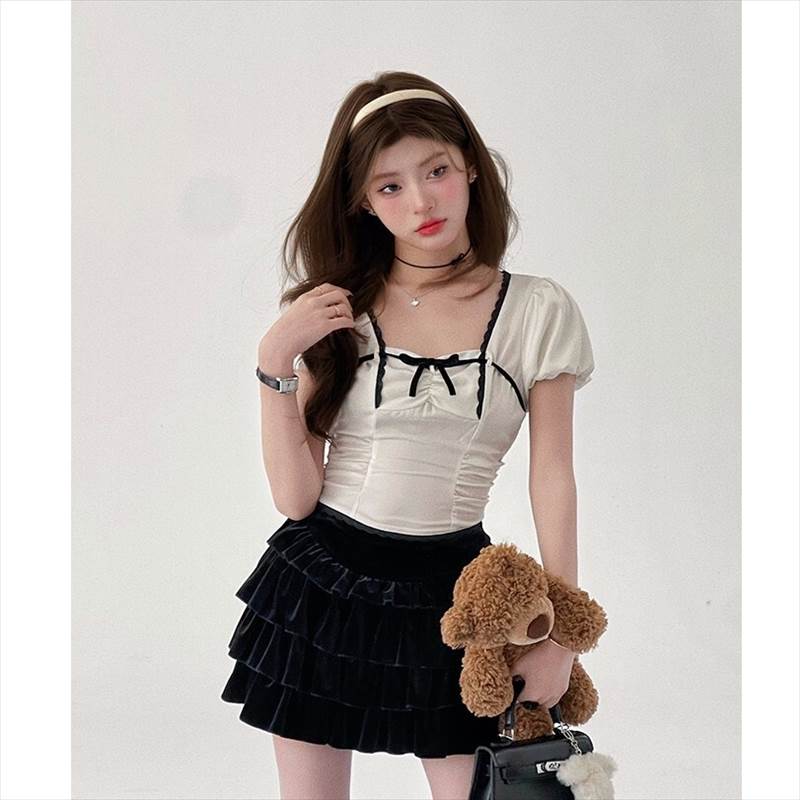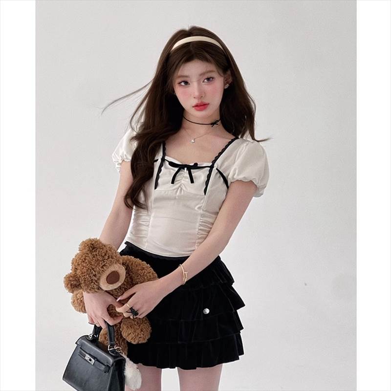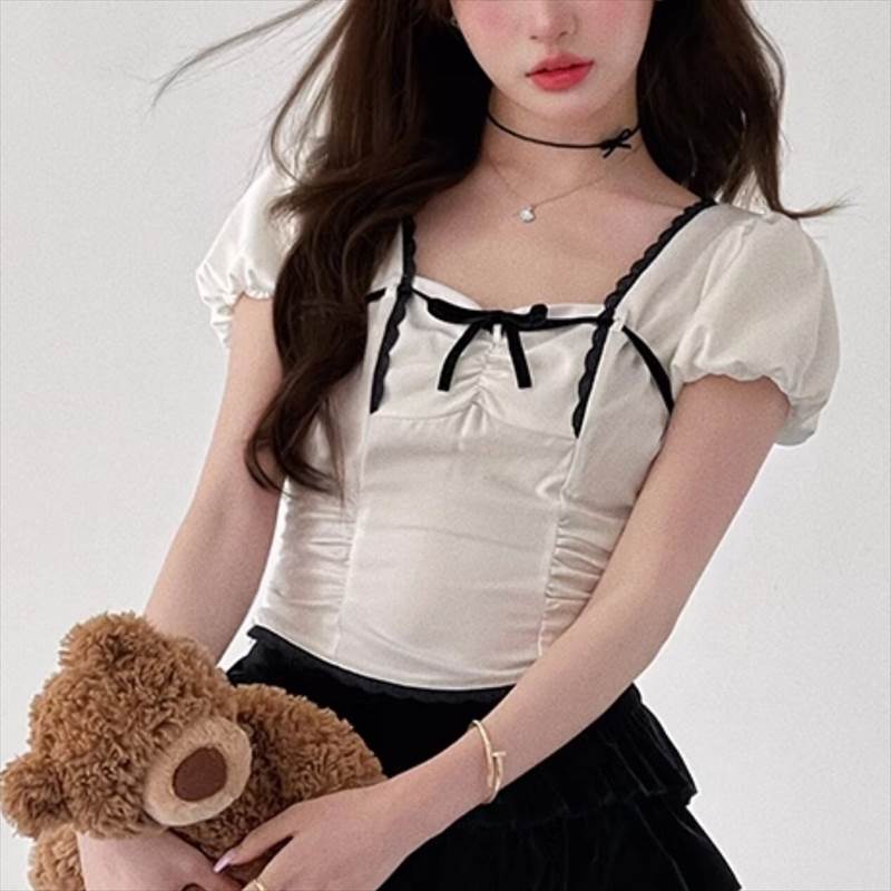 胸元リボン クロップドブラウス レディース トップス ブラウス スリム 細身 ショート 半袖 ボリューム袖 パフスリーブ スクエアネック 襟なし 鎖骨見せ ギャザー 配色 スカラップレー デコルテ見せ