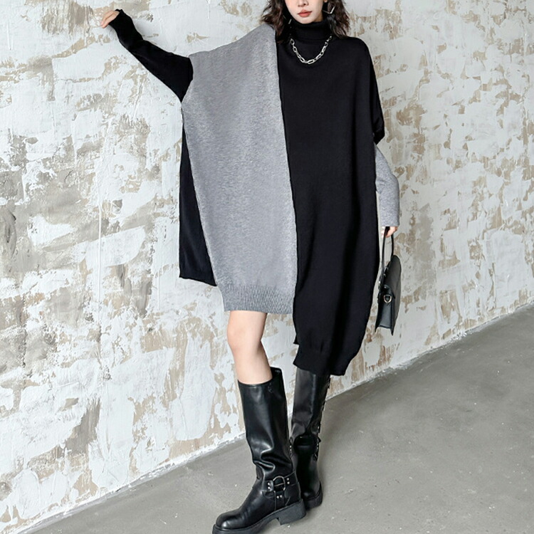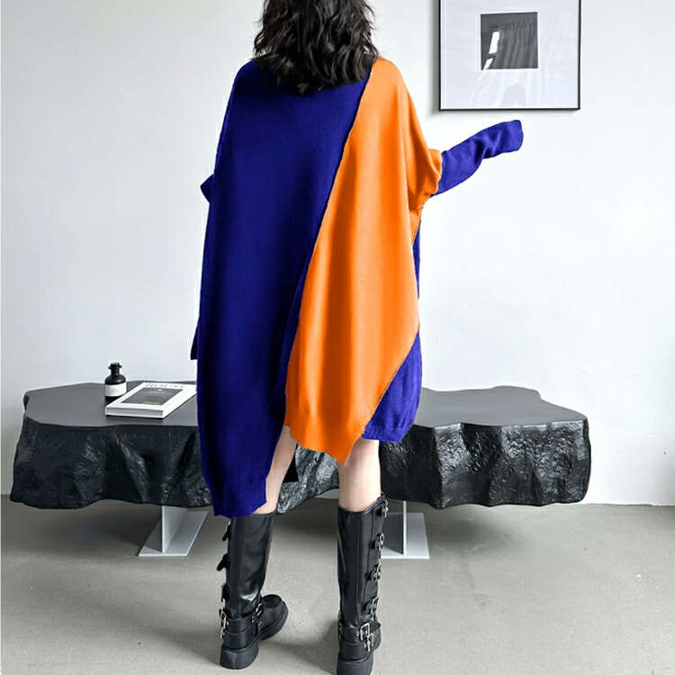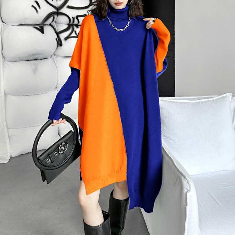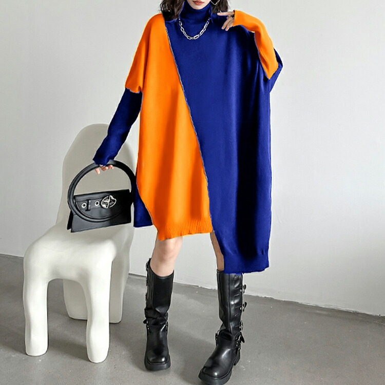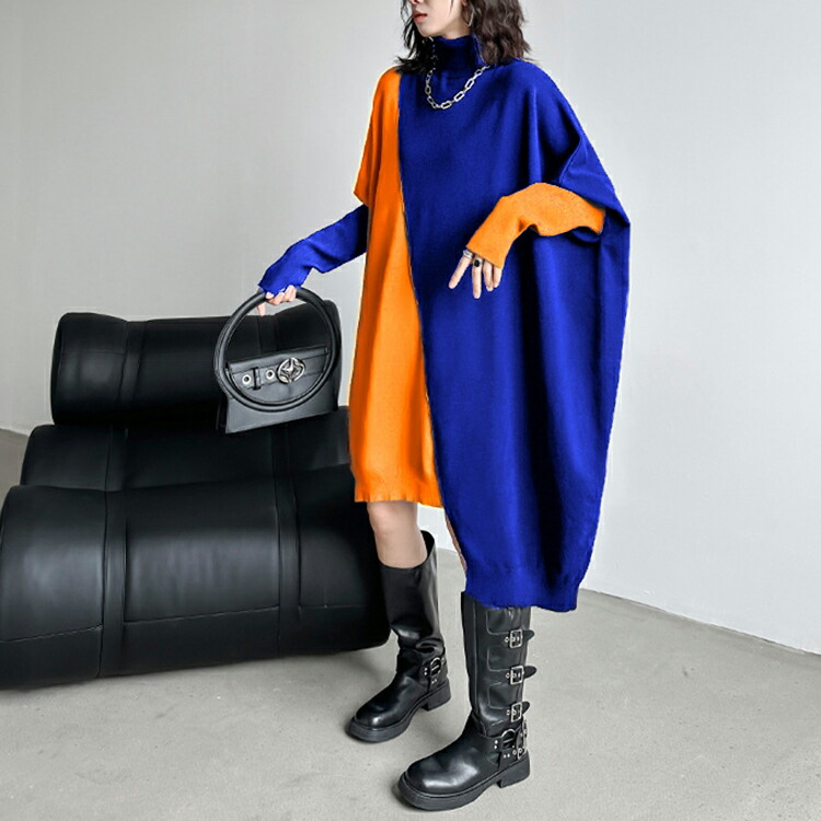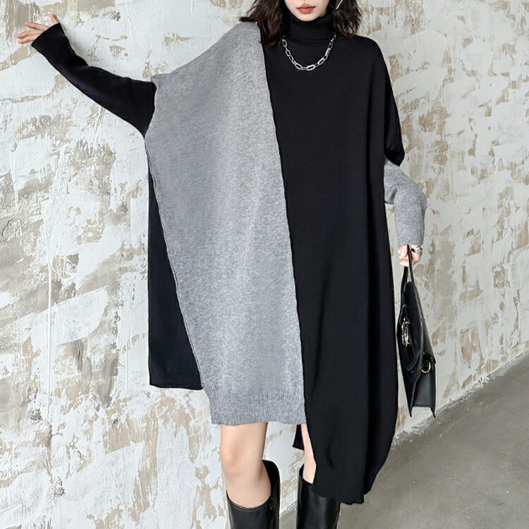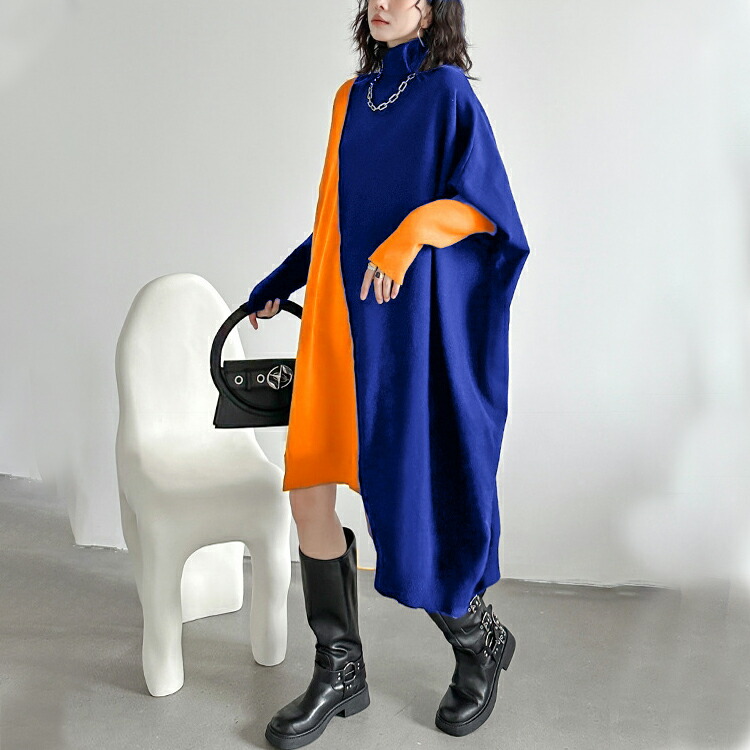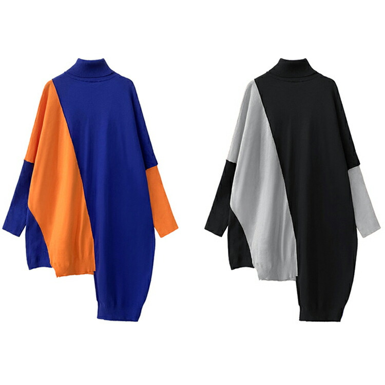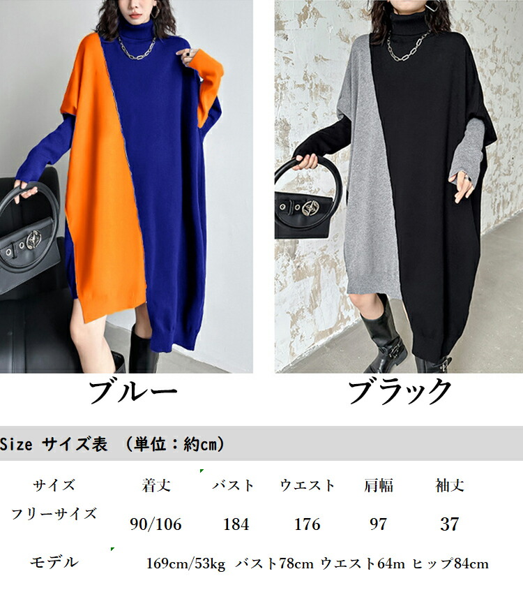 配色デザインドルマンニット ワンピース レディースファッション 続々登場 ブラック ブルー