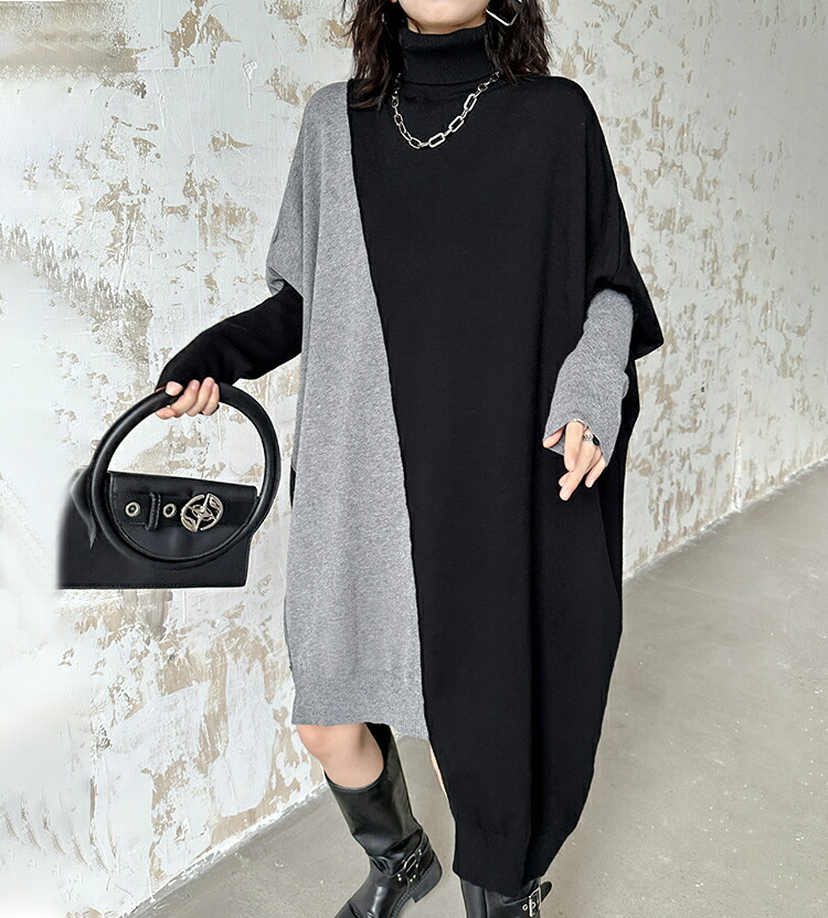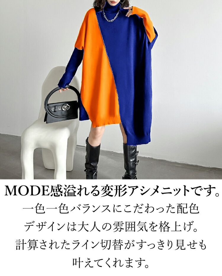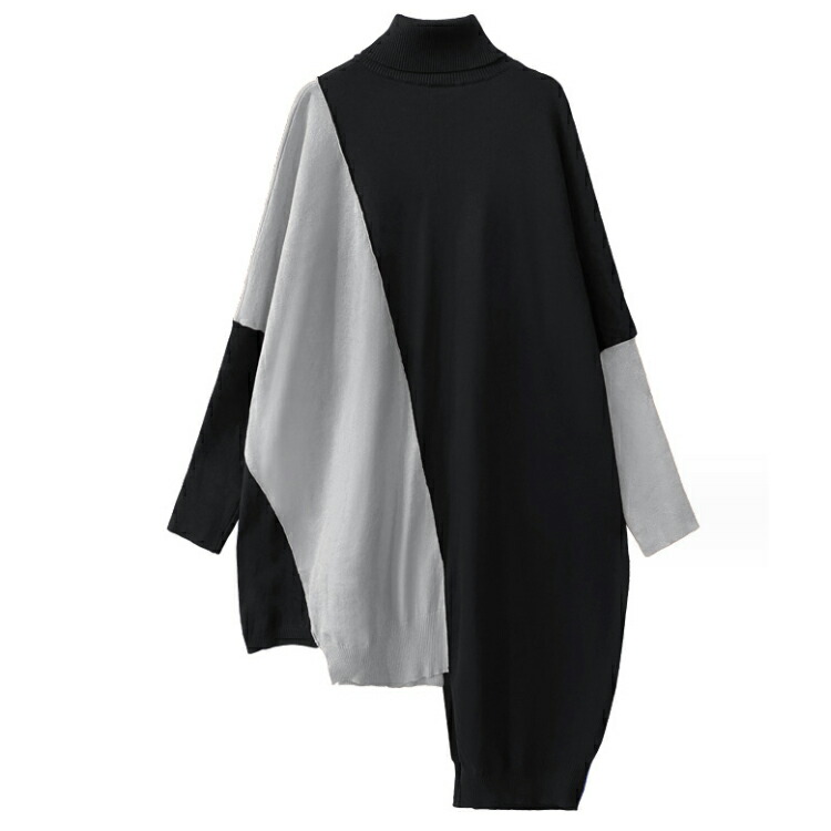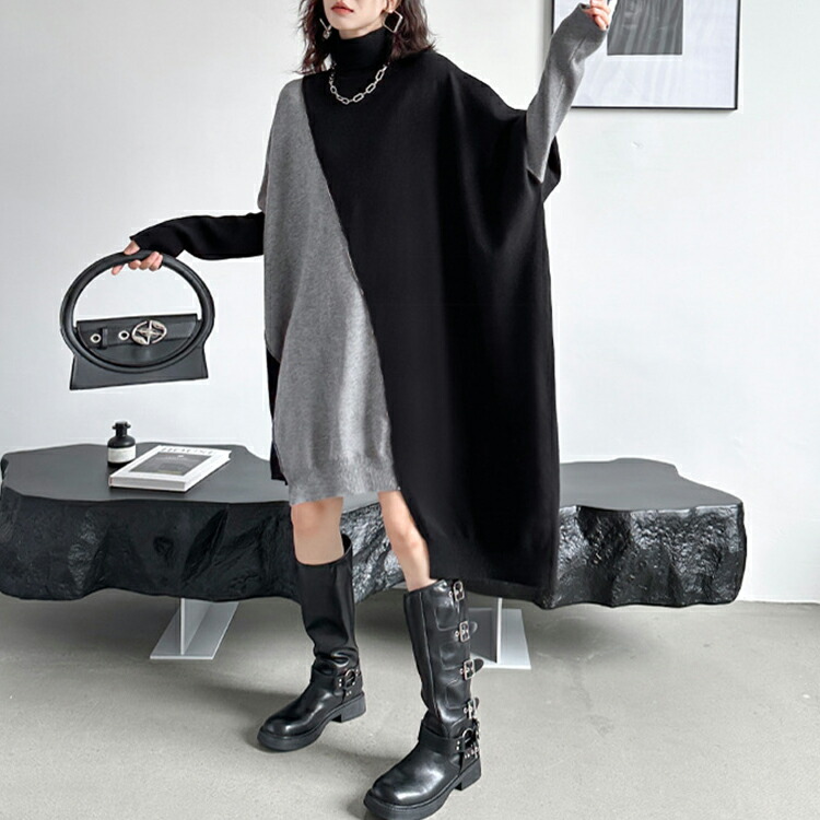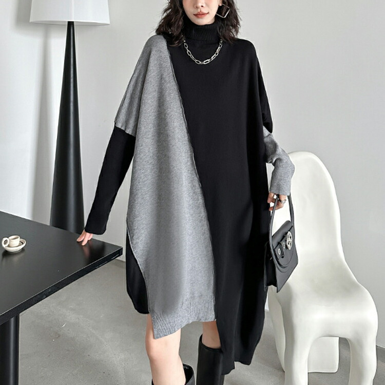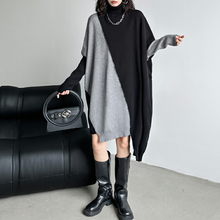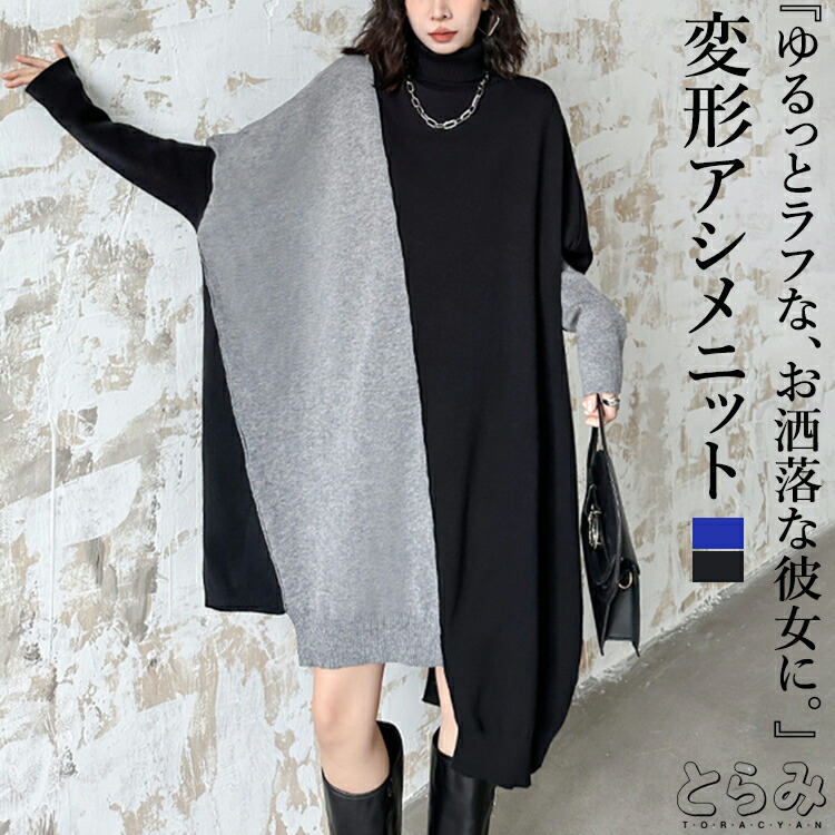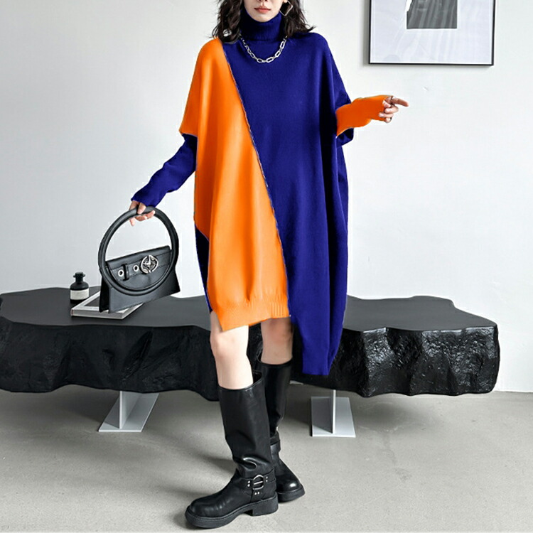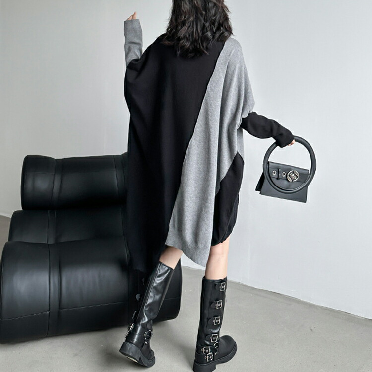配色デザインドルマンニット ワンピース レディースファッション 続々登場 ブラック ブルー