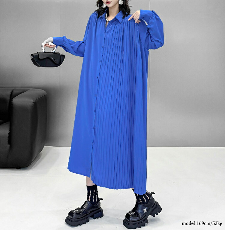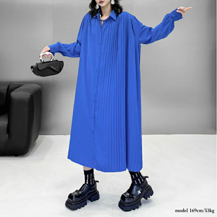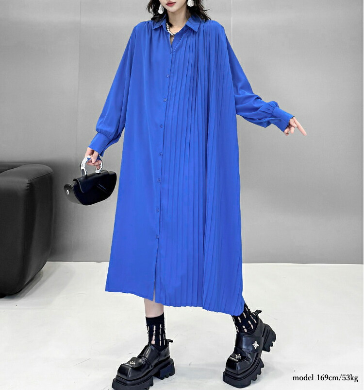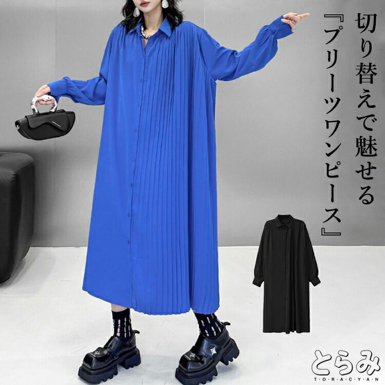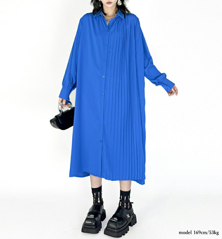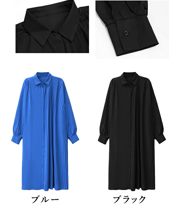 プリーツシャツワンピース シャツワンピ ブラック ブルー