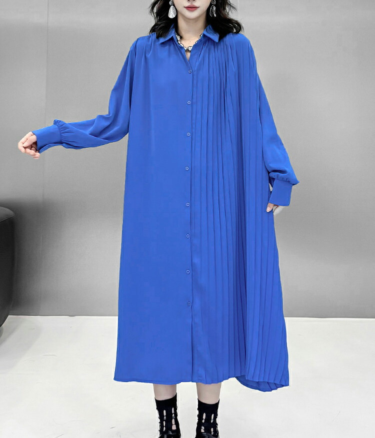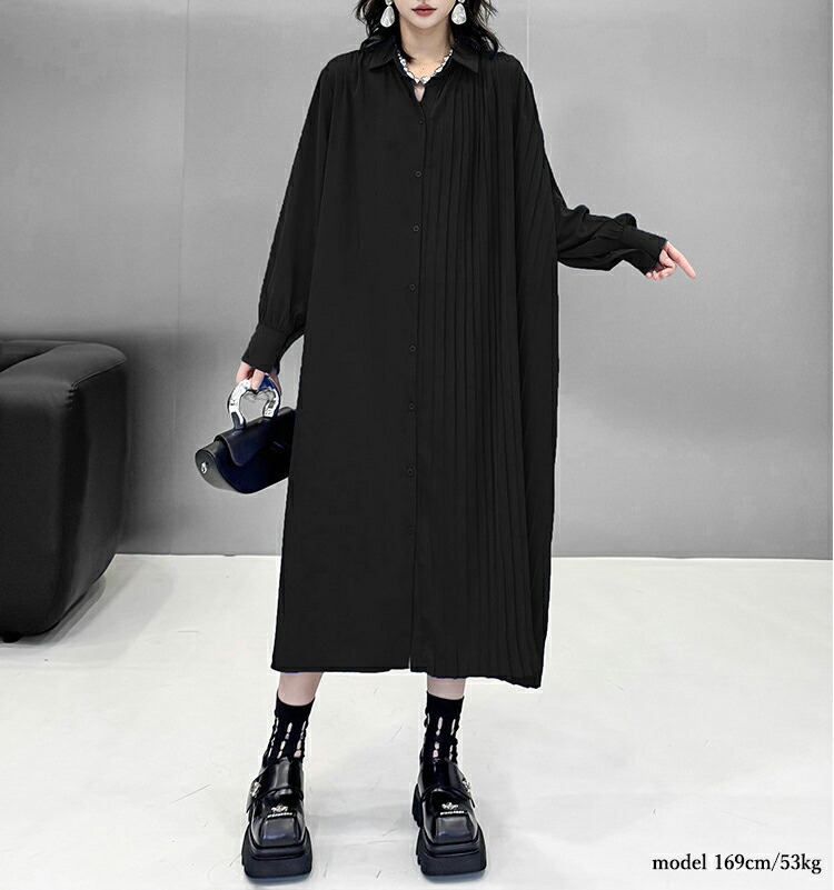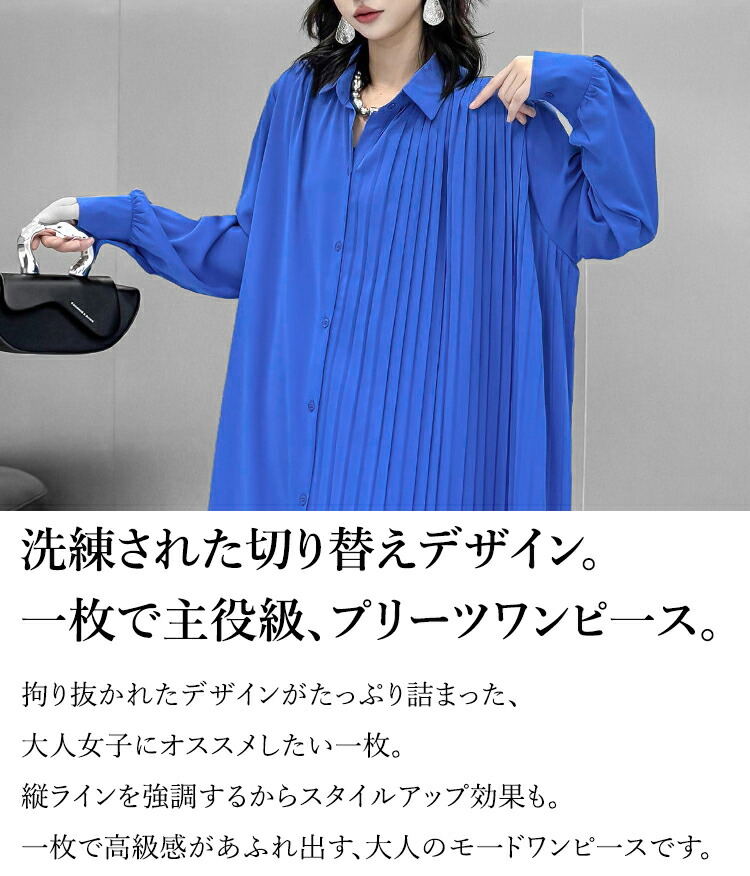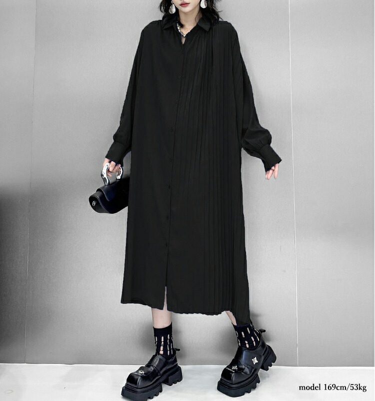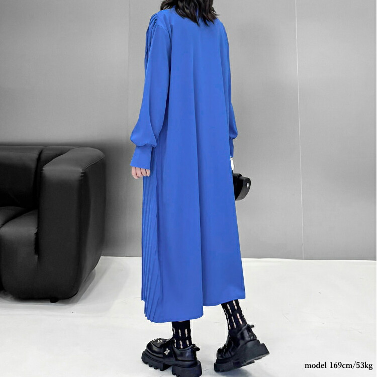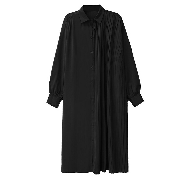 プリーツシャツワンピース シャツワンピ ブラック ブルー