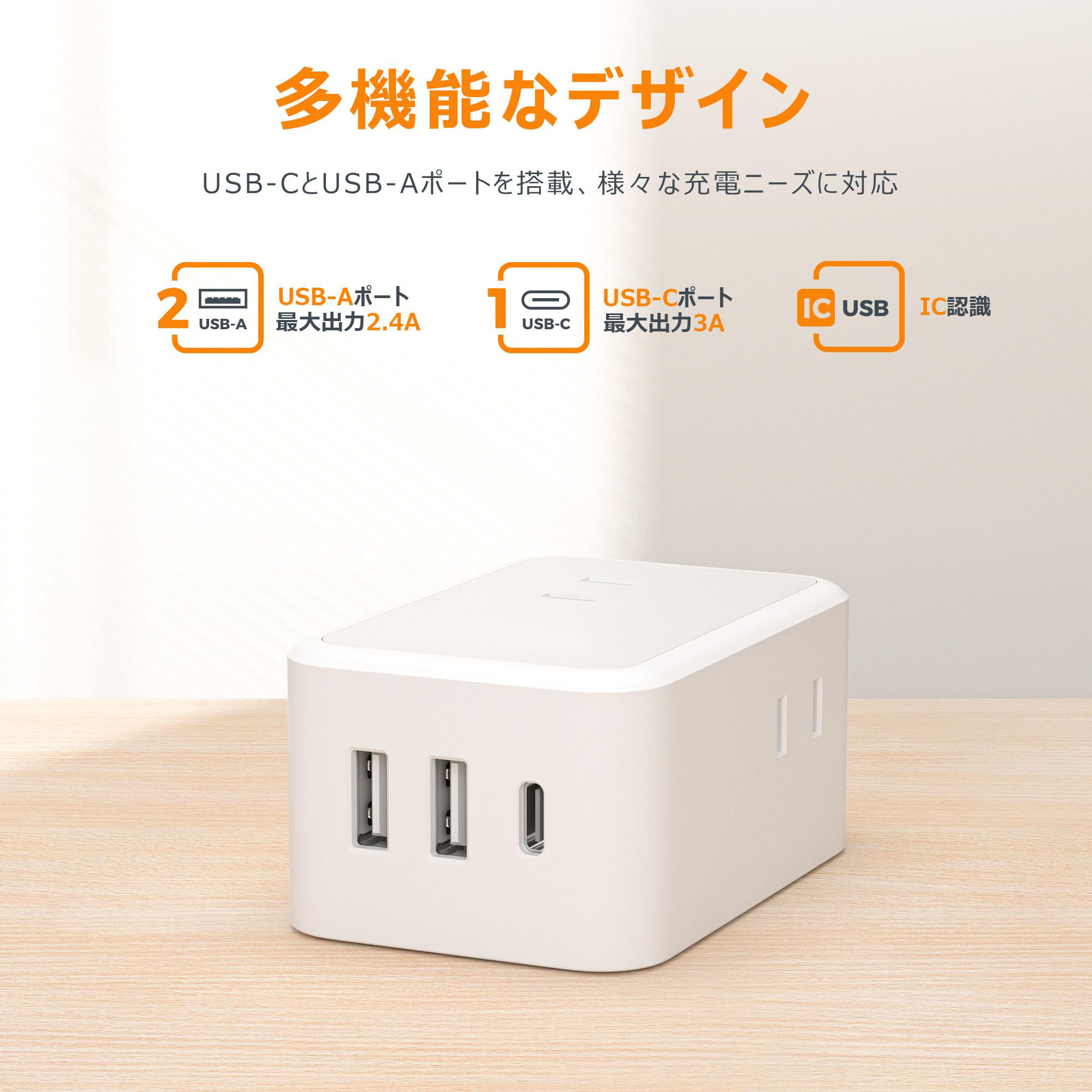 この製品には、2種類のUSBポートが搭載されています。USB-AポートとUSB-Cポートを備えており、スマートフォン、タブレット、その他のデバイスを効率的に充電することができます。一度に複数のデバイスを接続できるため、家庭でもオフィスでも非常に便利です。