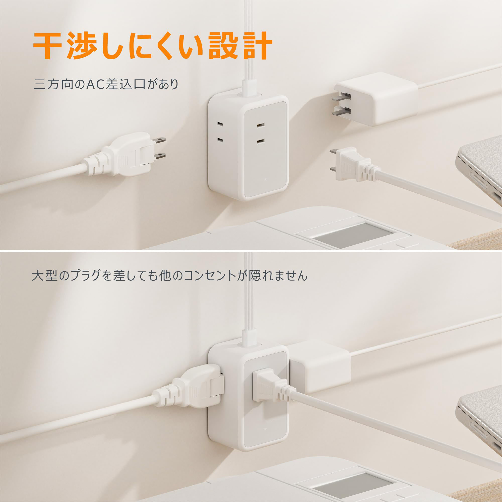 【一台6役/干渉しにくい】この延長コードは正面と左右に1口ずつACコンセントを搭載しているほか、USBポート(USB-A2、USB-C1)も3口用意されています。そのため、最大6台まで同時に充電が可能で、コンセントが足りないという問題を解決します。また、ACコンセントが左右に分散しているため、使用時の干渉を防ぎながら接続可能です。