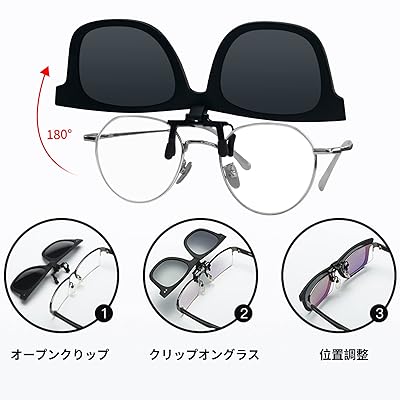 【眼鏡着用者ためのサングラス】:クリップをメガネに挟んで、メガネに装着後もサングラス部分を跳ね上げする事ができます。メガネの上から付けられるUVカットのクリップ式サングラスです。ほとんどのメガネに適しています。
