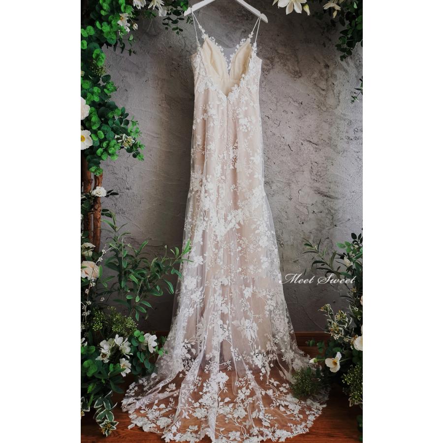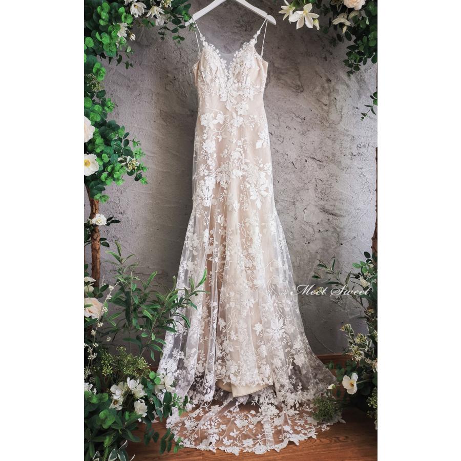 ウェディングドレス ウエディングドレス 二次会 結婚式 前撮り ブライダル ロングドレス 花嫁 スレンダードレス シャンパンベージュ 総レース 袖なし 海外挙式 フォトウェディング キャミ バッグレス