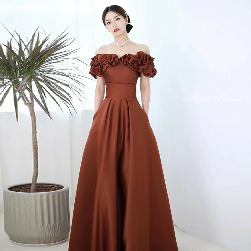 カラードレス ウェディングドレス ウエディングドレス イブニングドレス Aラインドレス オフショルダー ブラウン 編み上げ 発表会 演奏会 結婚式 花嫁パーティードレス ロングドレス カクテル 二次会