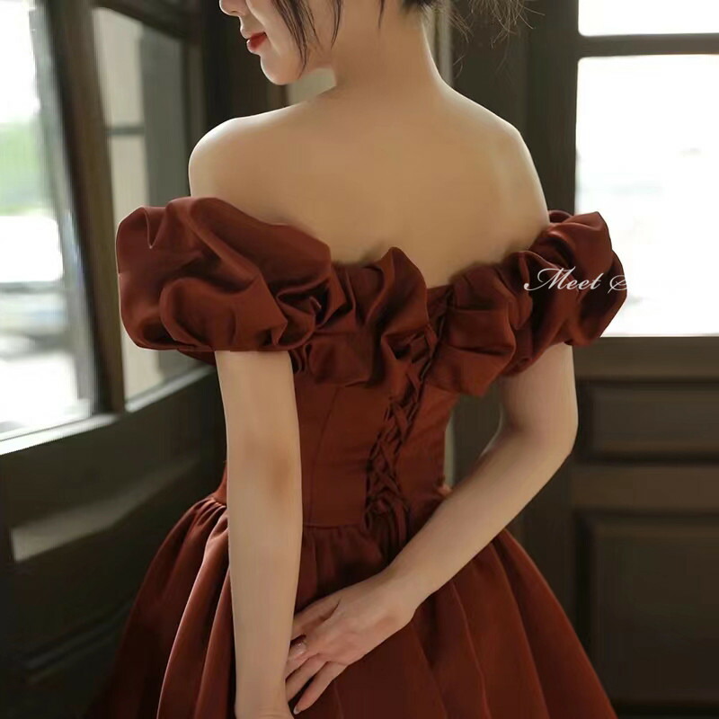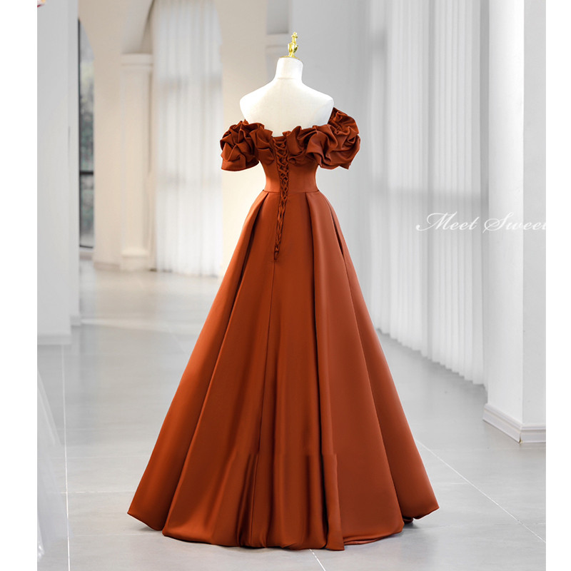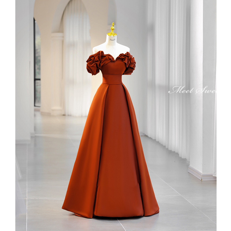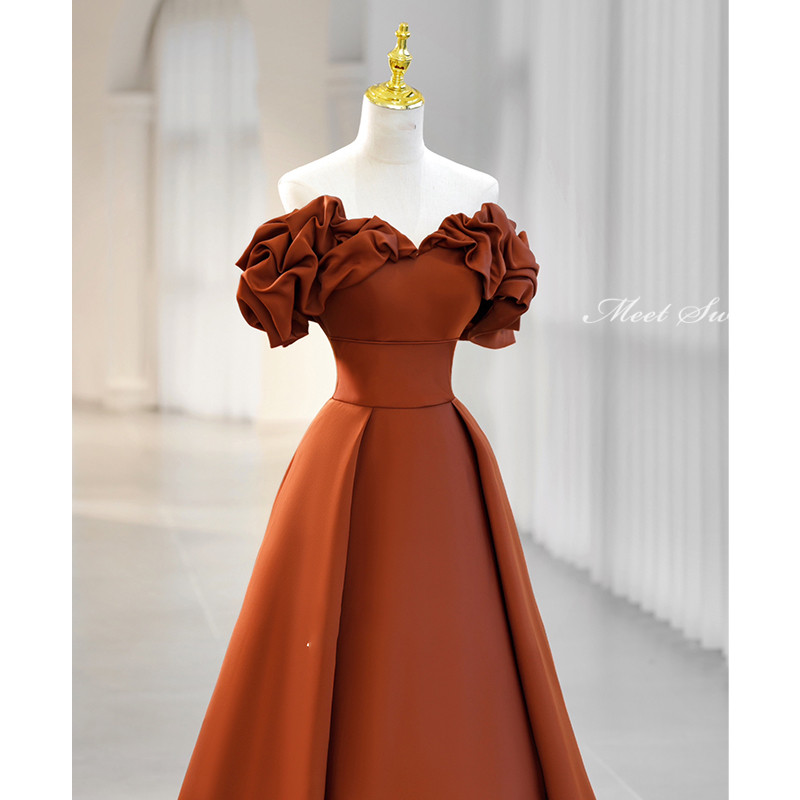 このテラコッタ色のAラインドレスは、オフショルダーのデザインで、ギャザーが施された袖が特徴です。
