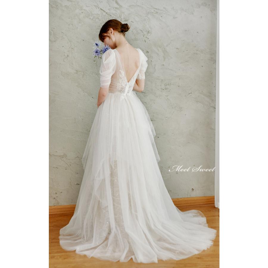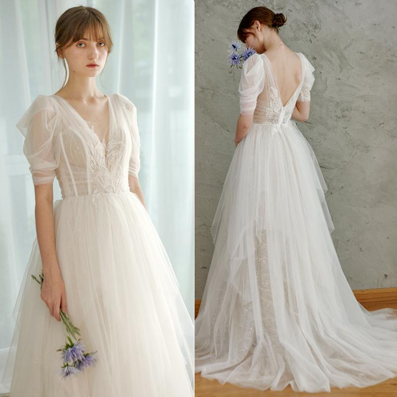 ウェディングドレス ウエディングドレス 二次会 結婚式 前撮り ブライダル ロングドレス 花嫁 プリンセスラインドレス Aラインドレス チュール 半袖 海外挙式 フォトウェディング オフホ ファスナー
