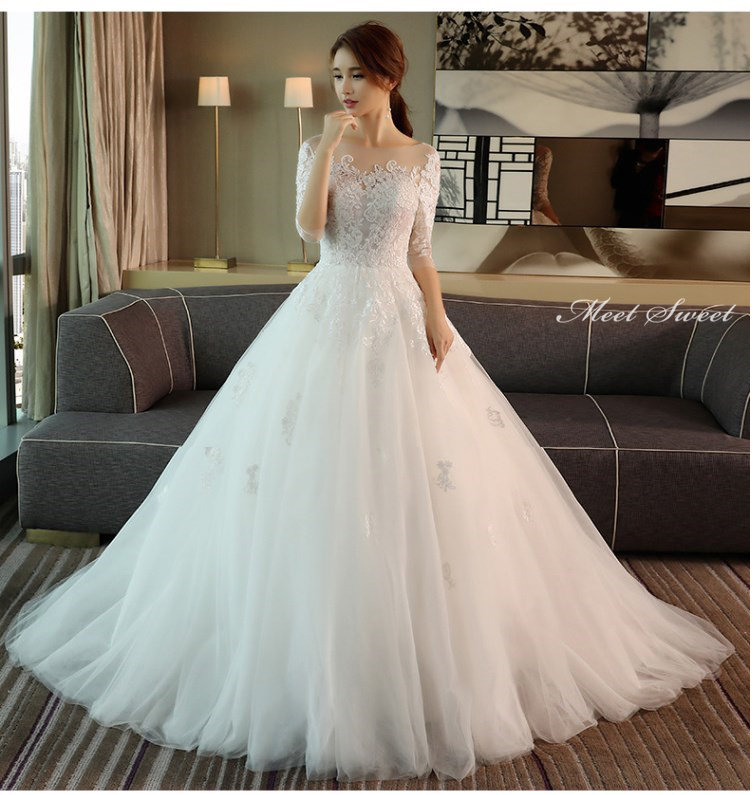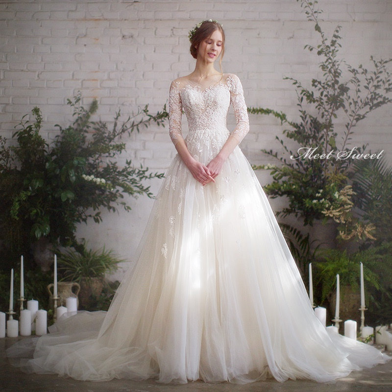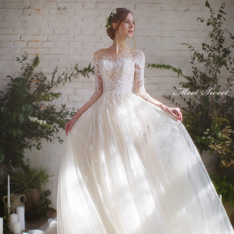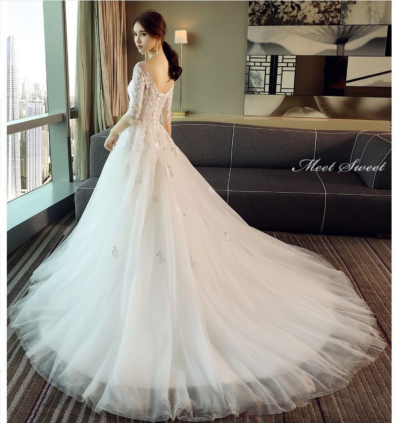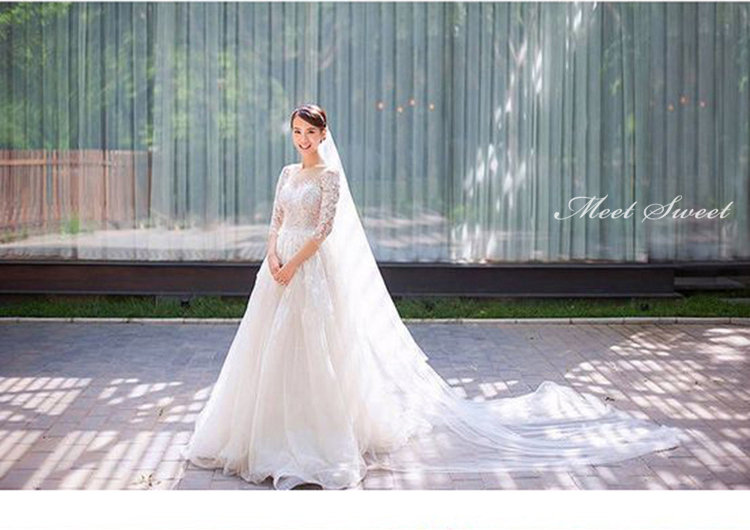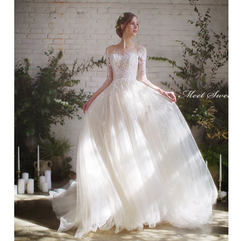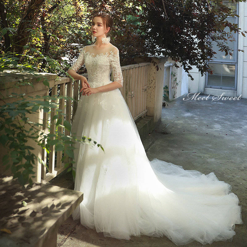 ウェディングドレス 花嫁 二次会ドレス ウエディングドレス 結婚式 新婦 ロングドレス Aラインドレス チュール レース トレーンドレス 6分袖 海外挙式 披露宴 編み上げ 大人 前 ブライダルドレス