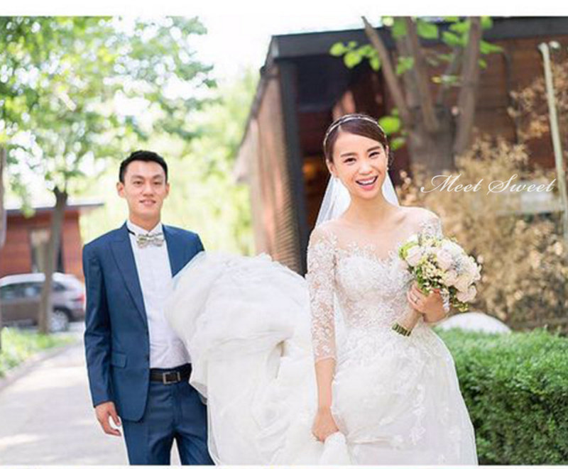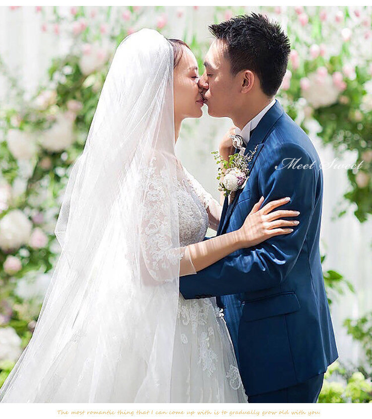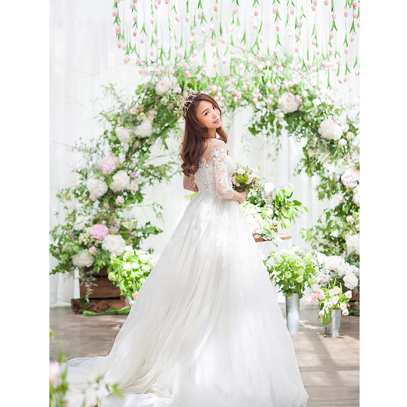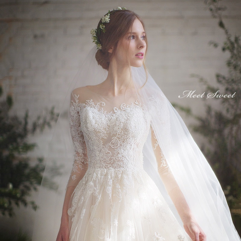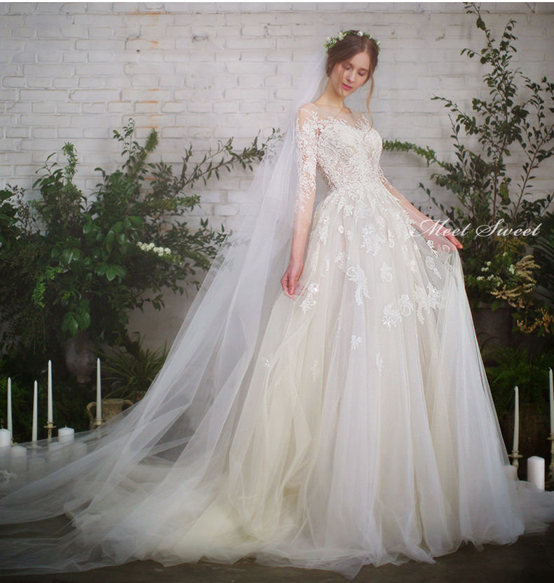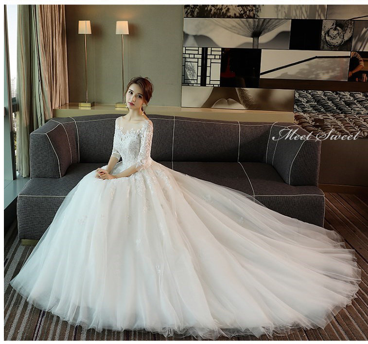 ウェディングドレス 花嫁 二次会ドレス ウエディングドレス 結婚式 新婦 ロングドレス Aラインドレス チュール レース トレーンドレス 6分袖 海外挙式 披露宴 編み上げ 大人 前 ブライダルドレス