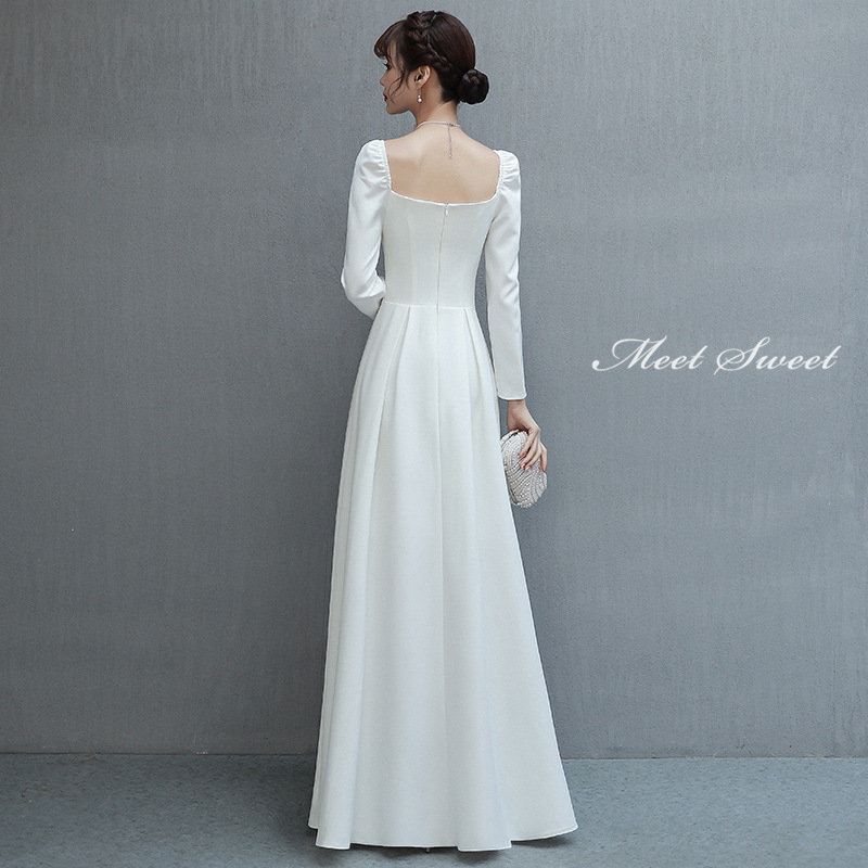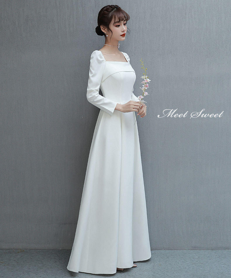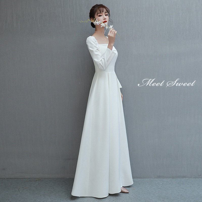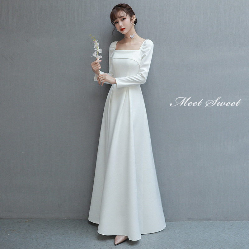 ウェディングドレス 二次会ドレス 結婚式 ブライダルドレス 新婦 ロングドレス サテン 長袖 袖あり ロングスリーブ シンプル ホワイト 前撮り 海外挙式 ウエディングドレス 編み上げ パーティ 花嫁