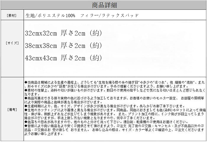 角型 クッション チェアパッド 椅子用 type1 type2 type3 type4 type5 type6 type7 type8 type9 type10 32cmx32cm 厚さ2cm (約) 38cmx38cm 厚さ2cm (約) 43cmx43cm 厚さ2cm (約)