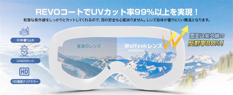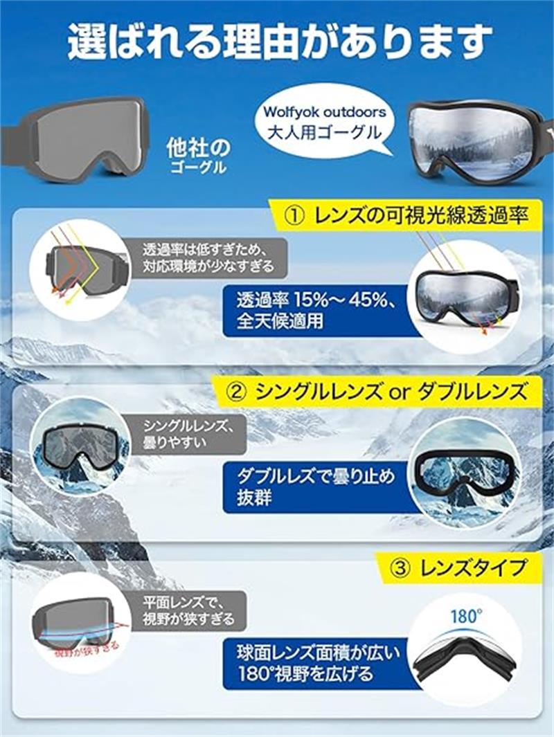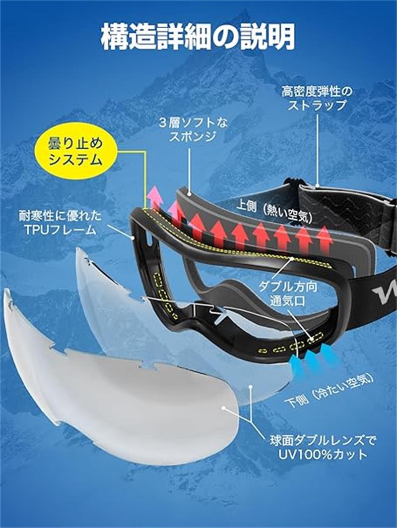 【ダブルレンズで曇り止め】 ダブルレンズとは2枚のレンズの間にある空気層があって、ゴーグルの内部と外部の間に気温差が生じにくいため、曇りにくい構造になっています。 一度曇ってしまうとその度にゴーグルを外して曇りを取る必要があるので、急に天候が変わって吹雪いてきた時などはゴーグルを外せず視界が遮られた状態で滑って来なくてはいけないので危険です。より楽しむためにレンズの内側に曇り止め加工レンズ、外側には傷がつきにくい2枚のレンズを採用します。家族と一緒に雪遊びでご使用される場合ダブルレンズのを選びましょう。