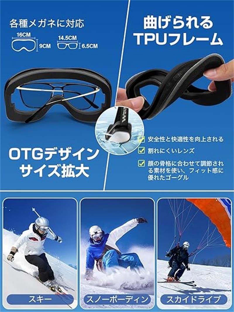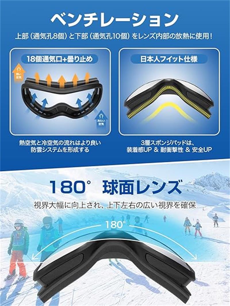 【OTG対応180°を超える広視野・ダブル球面レンズ】スキーゴーグルは球面レンズが球体に近づい見た目で、眼球の形状に近く平面に比べ距離感が裸眼に近づい、丸みを帯びたアーチ状でゴーグル内の面積が広いため曇りにくいところが魅力です。転倒しても壊れにくい、高品質で耐衝撃性も高いです。大人用スキーゴーグルはアジア人の頭部形状にフィットするよう設計されています。各種調整機能も含めて、快適で安全なフィッテイングを提供します。顔周りのフィット感がよく、長時間を着用しても疲れません。スノーボードの時、視線はいつでも眼球の弧度に近い球面レンズに垂直するようになり、歪みの少ない視野ができ、より鮮明に周囲の状況を把握でき、視界不良による衝突等のリスクを軽減し、安心してご利用いただけます。