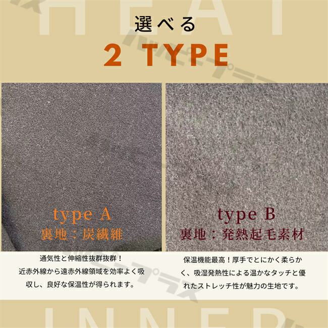 タイプA:優れた消臭効果を発揮し、通気性・ストレッチ共に抜群な炭繊維裏地をあしらわれたタイプA。近赤外線から遠赤外線領域を効率よく吸収し、良好な保温性が得られます。