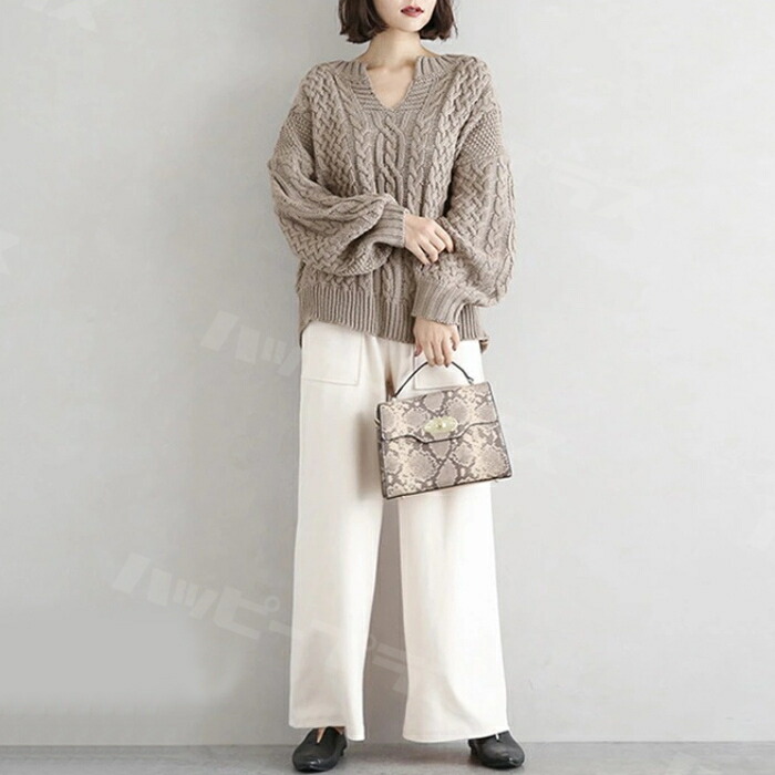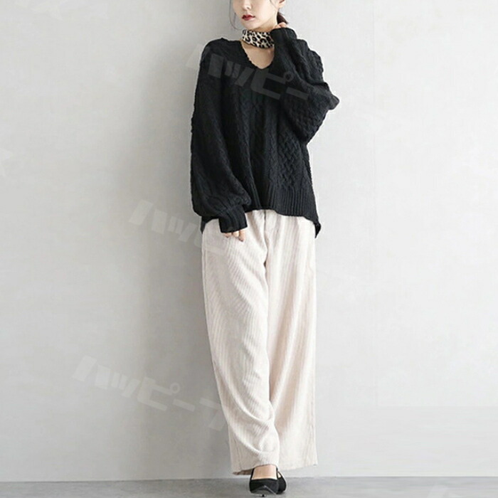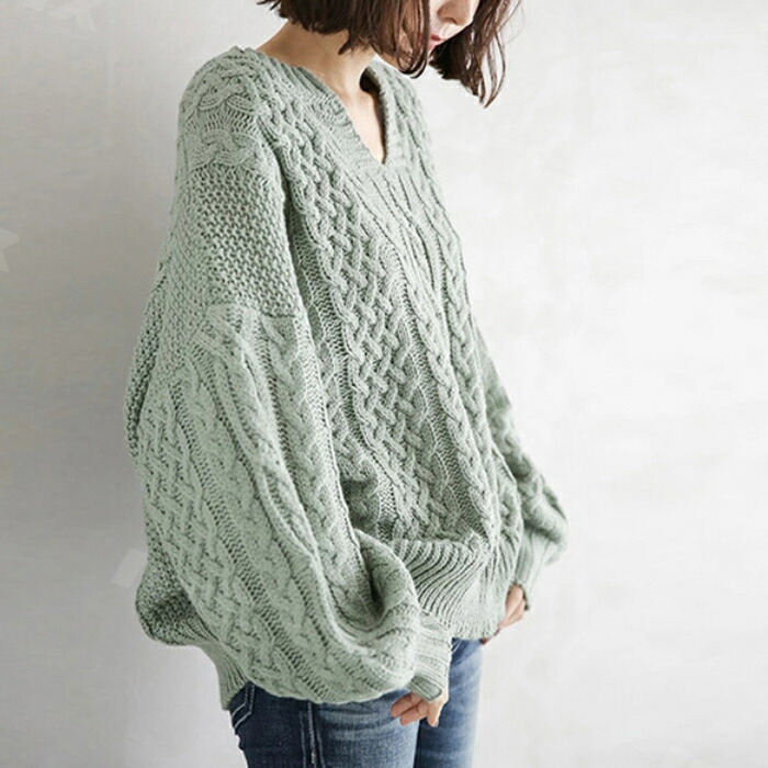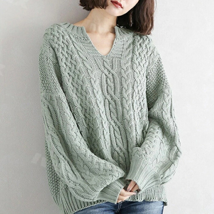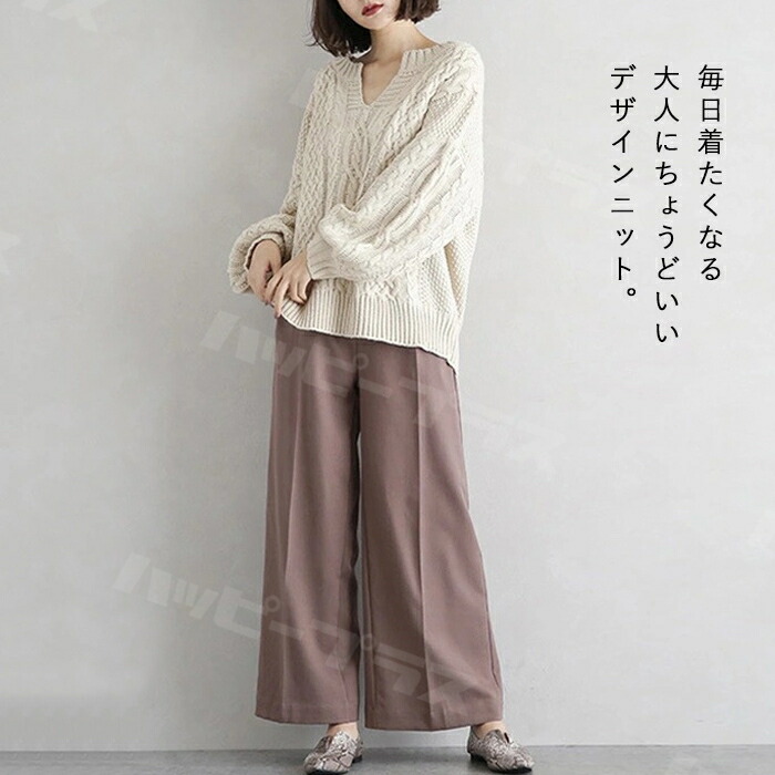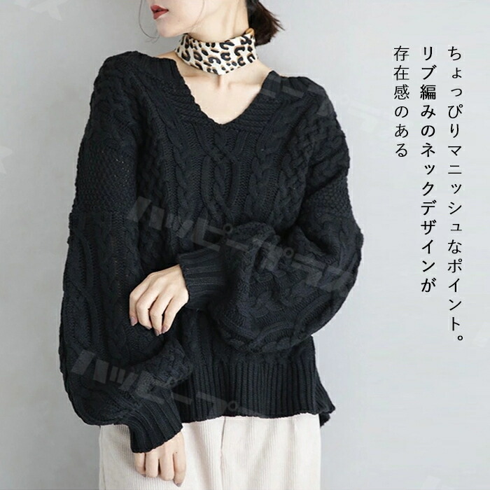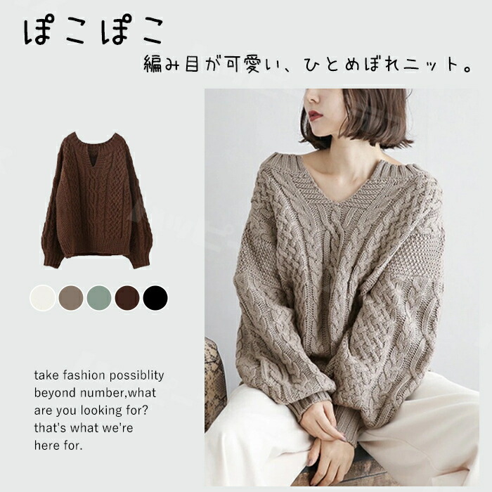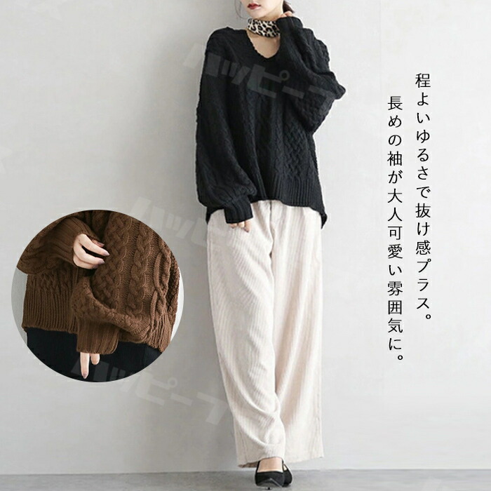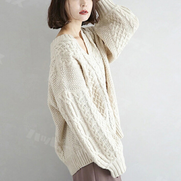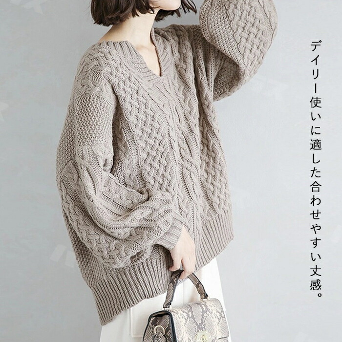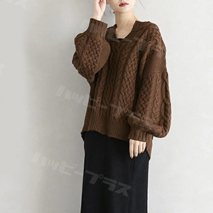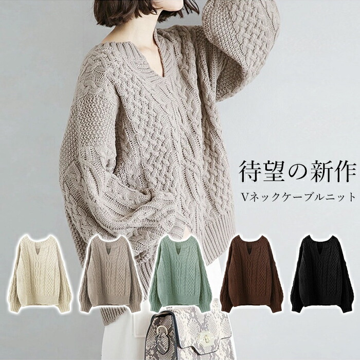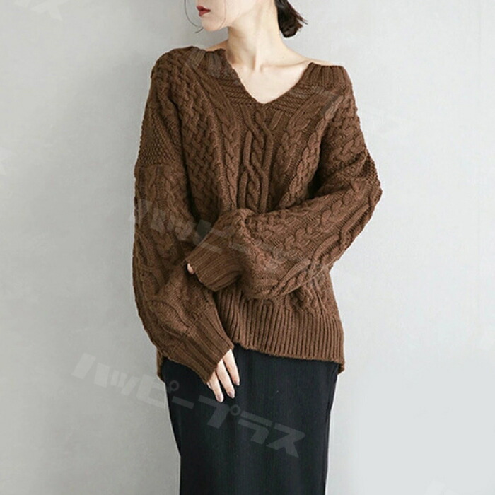 2点購入で800円オフクーポンあり♪ ニット セーター 長袖 レディース Vネック プルオーバー ドロップショルダー ニットセーター ケーブル編み チュニック カットソー ゆったり トップ 体型カバー