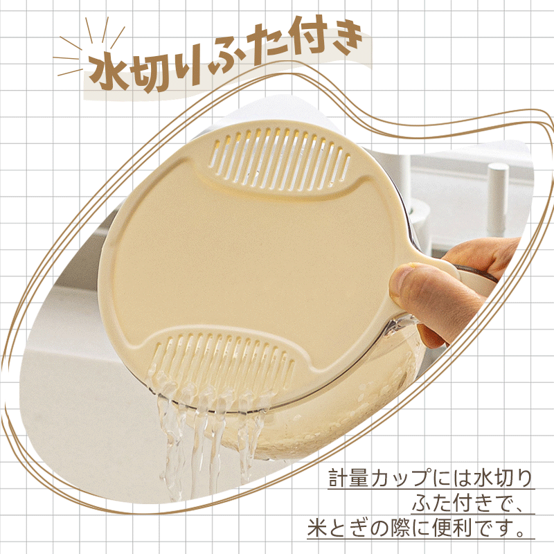 「計量カップ付き」水切りフタ付きで洗米も簡単です。