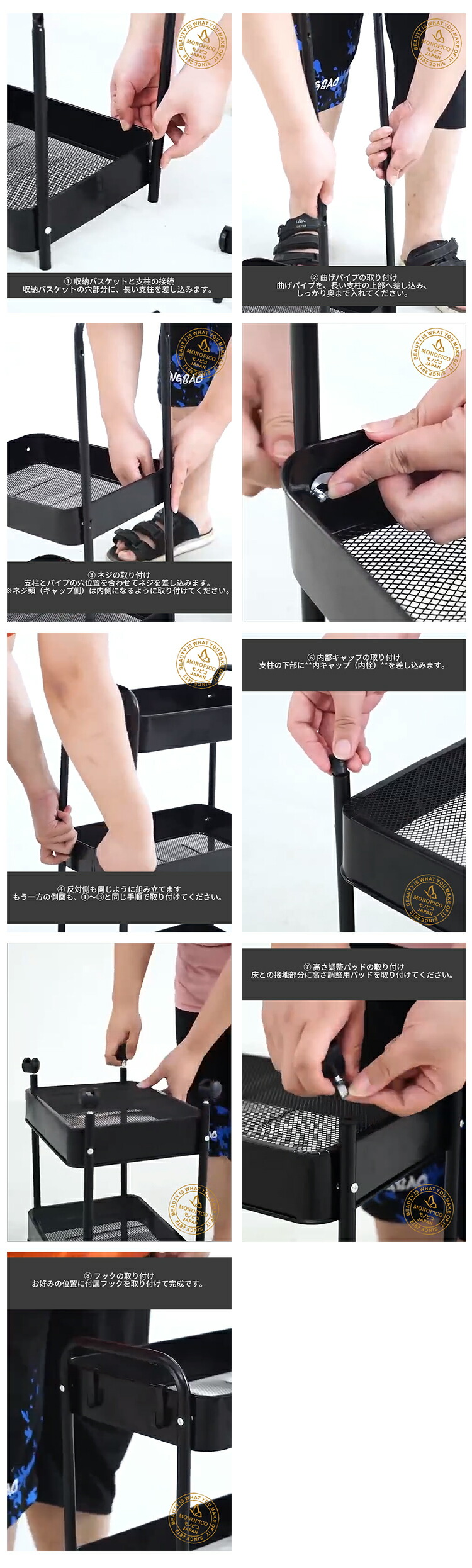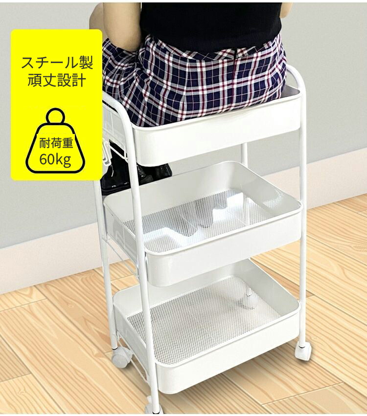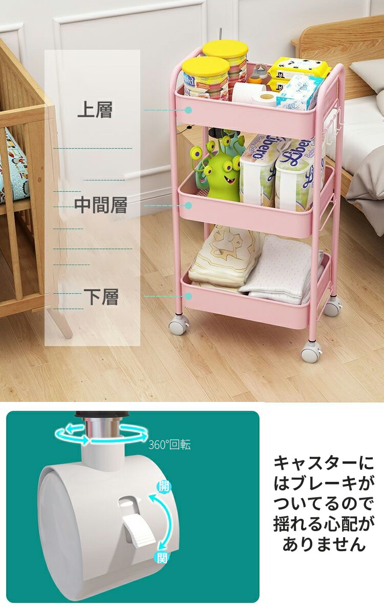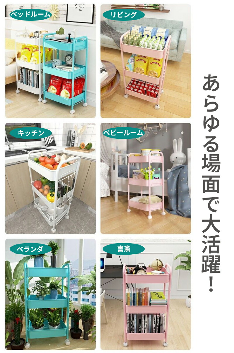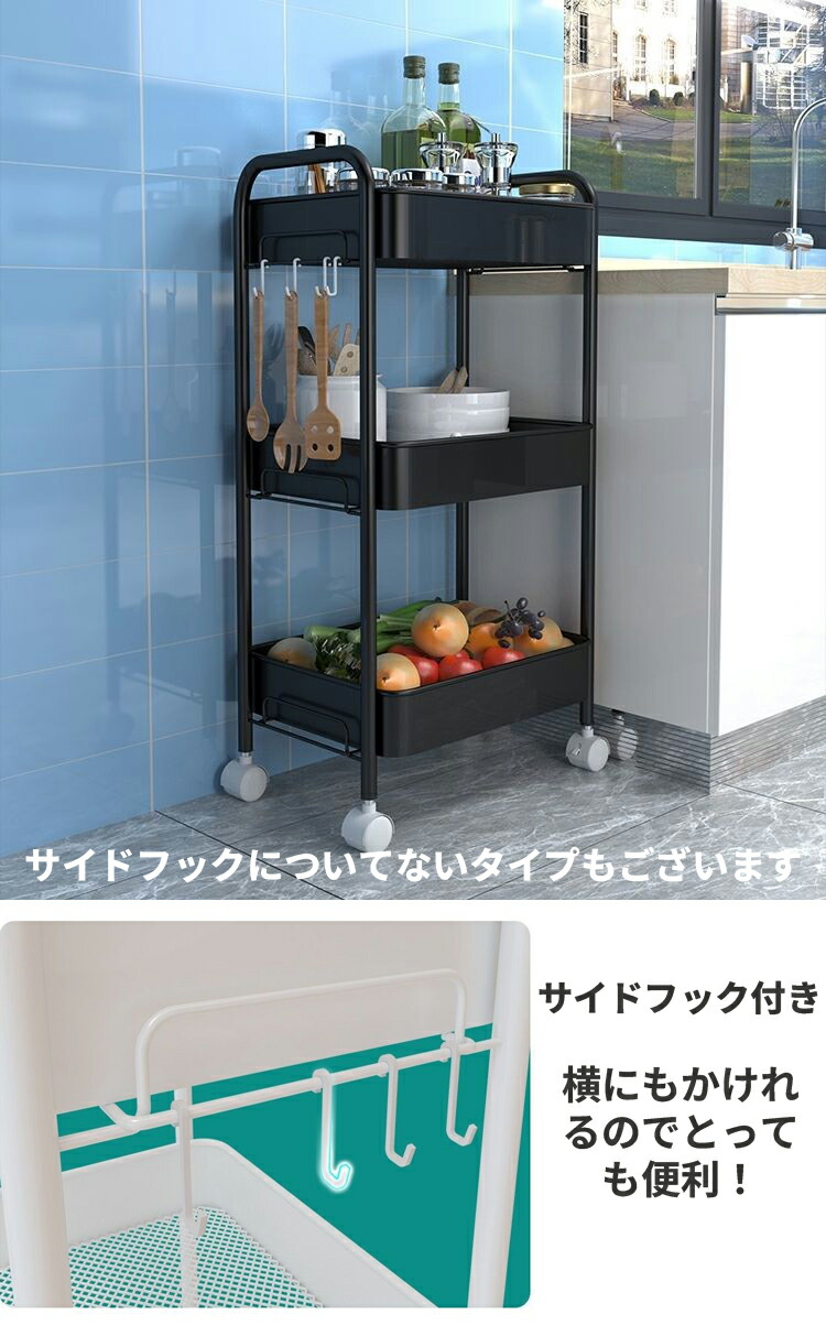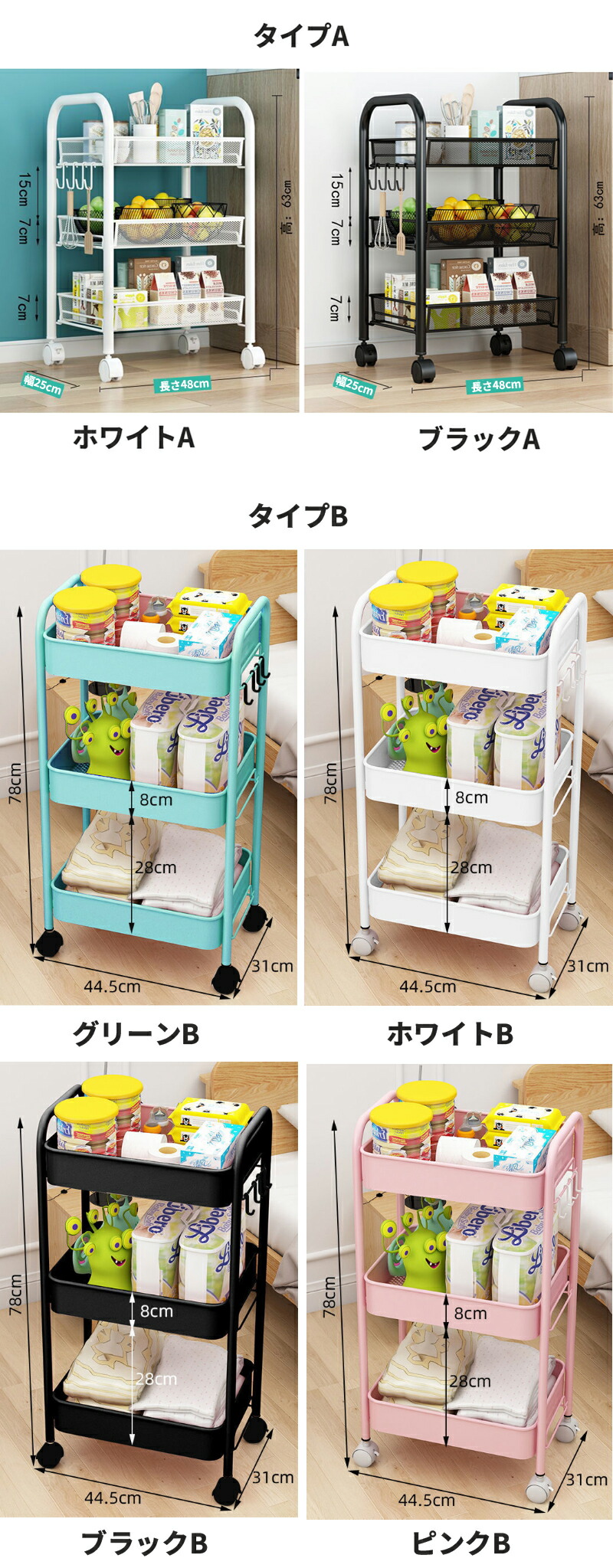 キッチンワゴン キャスター付き 3段 グリーンーB 44.5×31×78cm ブラックB 44.5×31×78cm ホワイトB 44.5×31×78cm ピンクB 44.5×31×78cm