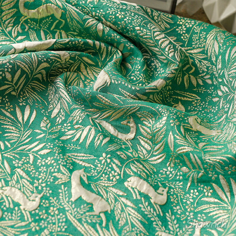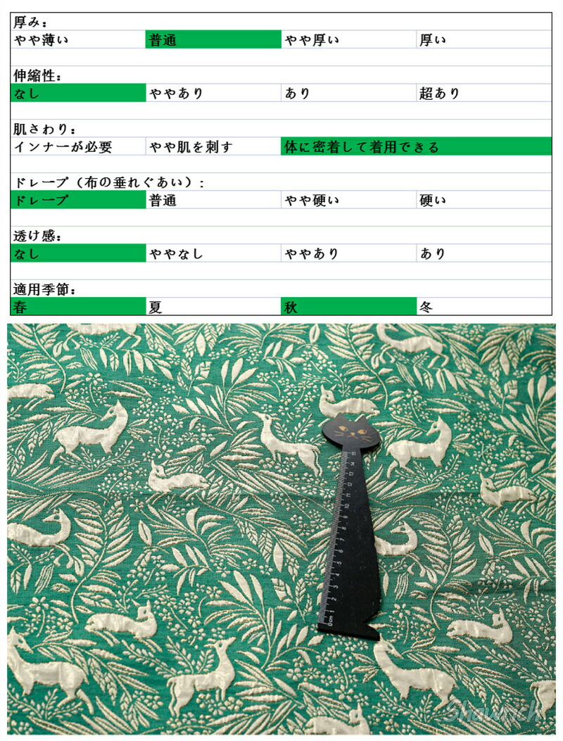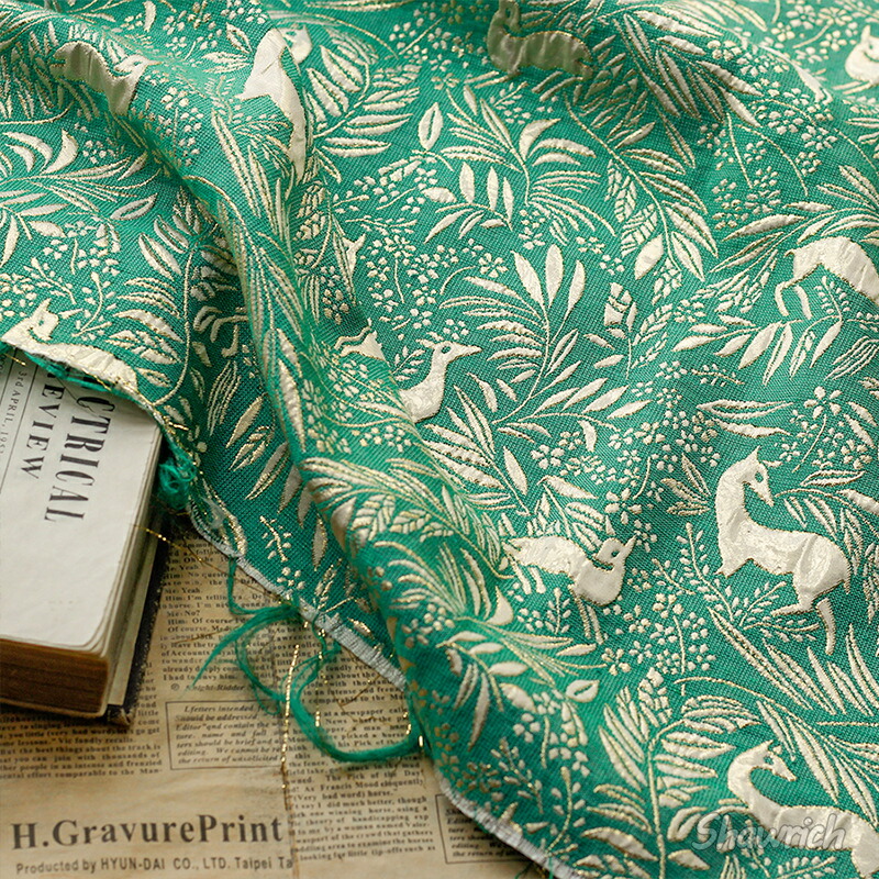 140cm幅 90cm単位 生地 布 植物柄 葉柄 ジャカード エンボス 布地 しか柄 グリーン ブルー 緑 鹿柄