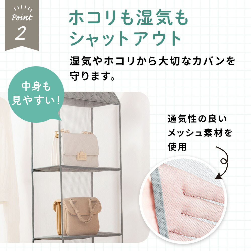 通気性の良いメッシュ素材で、大切なバッグを埃や湿気から守ります。