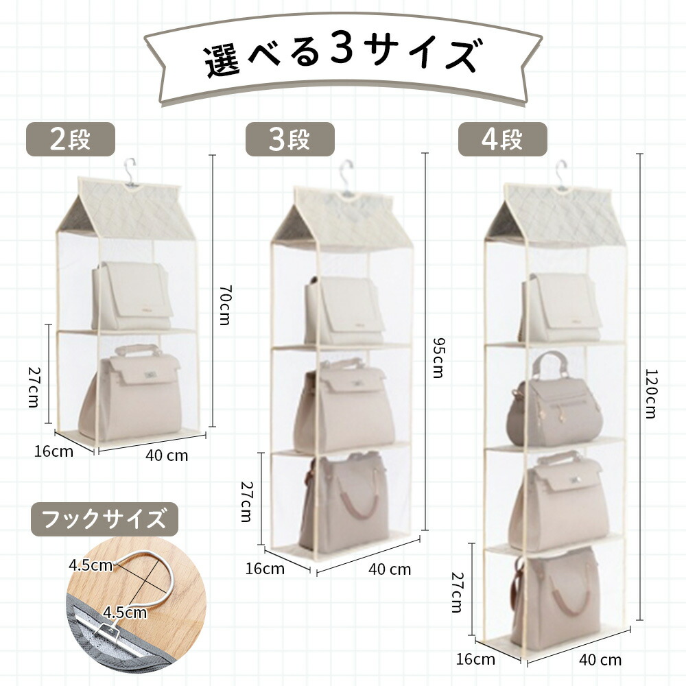 段、3段、4段の3サイズ展開。収納するバッグの数やクローゼットのスペースに合わせてお選びいただけます。