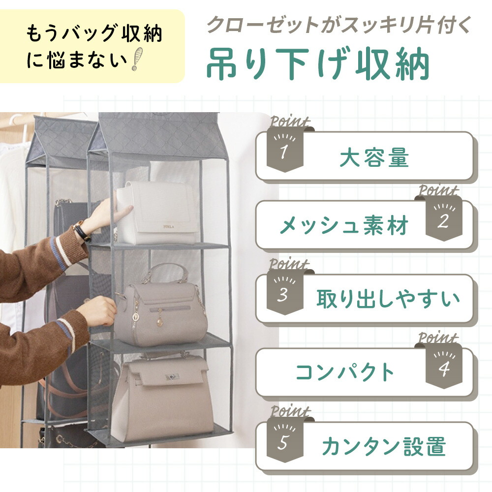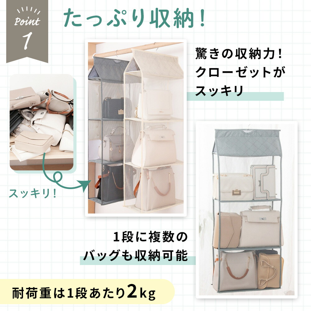 吊り下げ収納 バッグ カバン 鞄 かば グレー ベージュ 2段 3段 4段