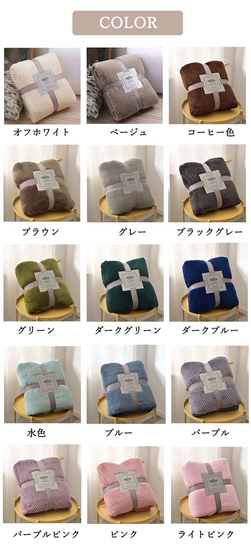 毛布 ブランケット シングル ダブル インテリア 寝具 収納 豊富 グレー ベージュ グリーン オフホワイト ブラウン ブルー ブラックグレー 水色 ダークブルー コーヒー色 パープル ピンク パープルピンク ライトピンク ダークグリーン 45×65cm 70×100cm 100×150cm 110×180cm 150×200cm 180×200cm 200×230cm