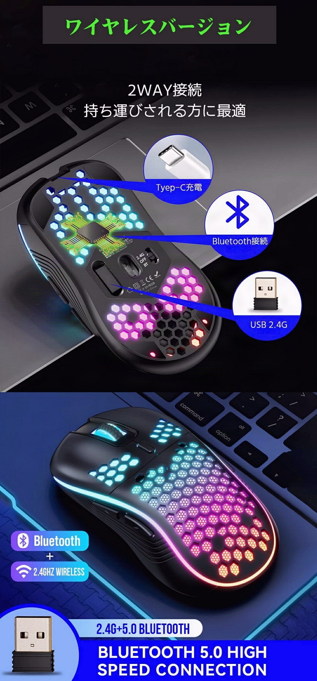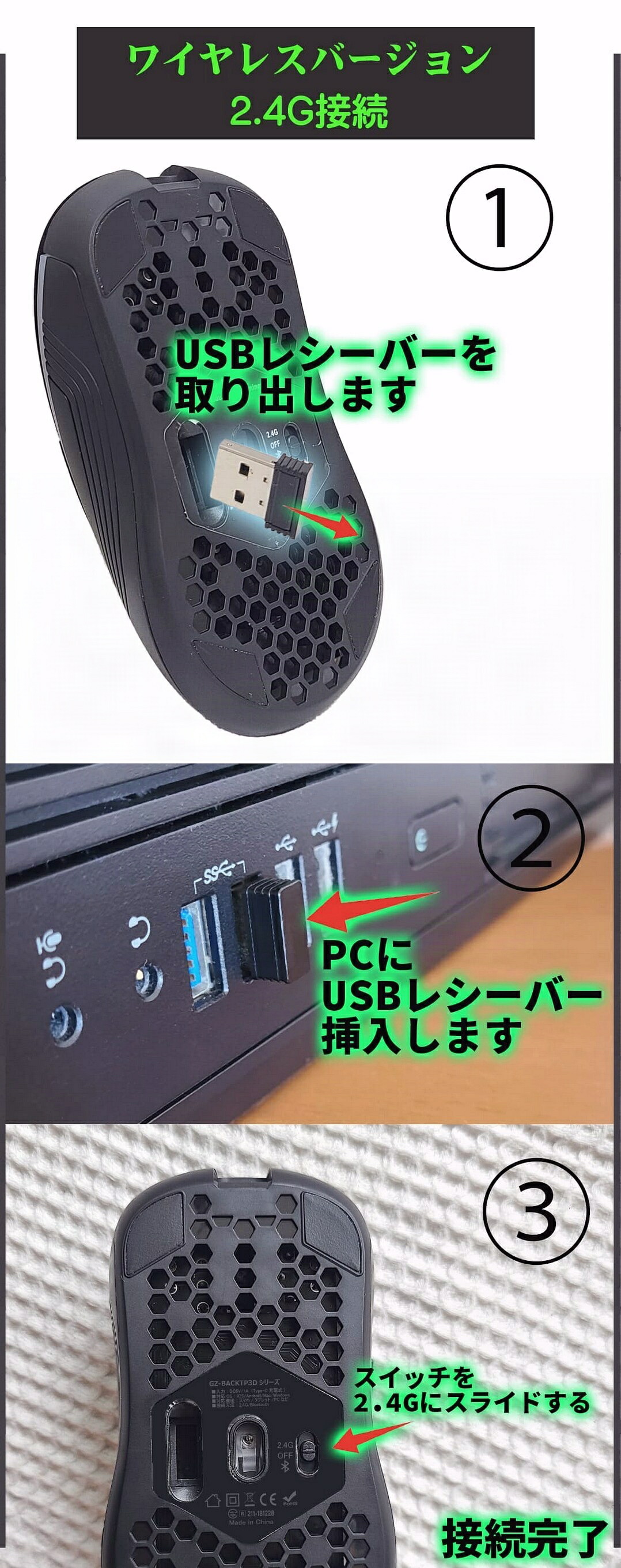 Bluetoothと2.4GHzワイヤレスを採用、2.4GはPCにUSBレシバーを接続するだけ、ドライバーの設定が一切不要。