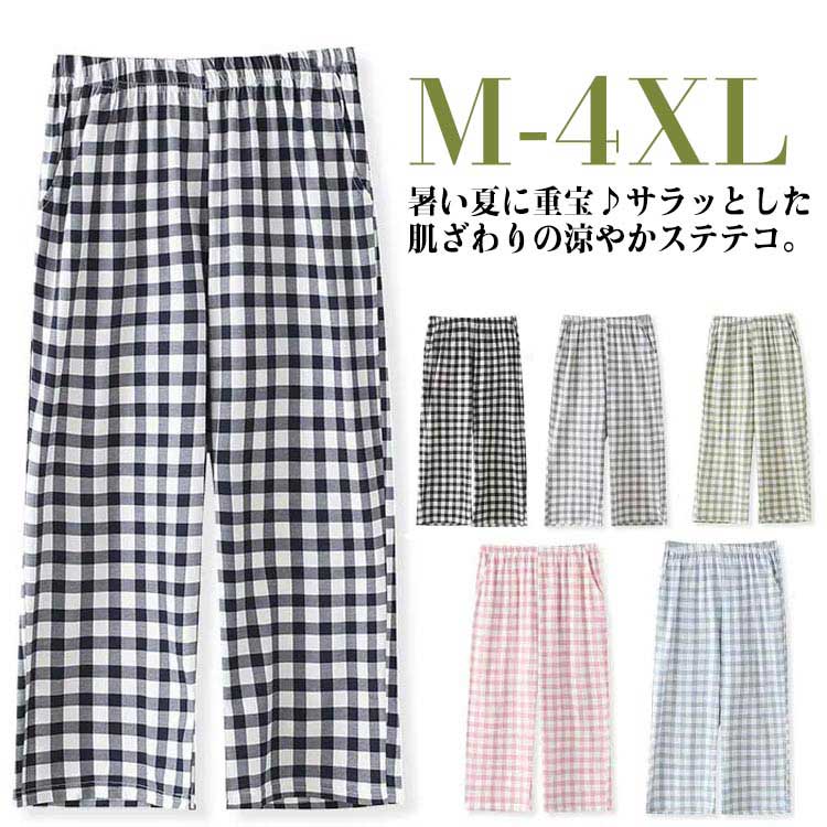 部屋着 ポケット 夏 綿 チェック柄 ボトムス パンツ 新登場! ブラック ネイビー グレー グリーン ピンク ライトブルー M L XL 2XL 3XL 4XL