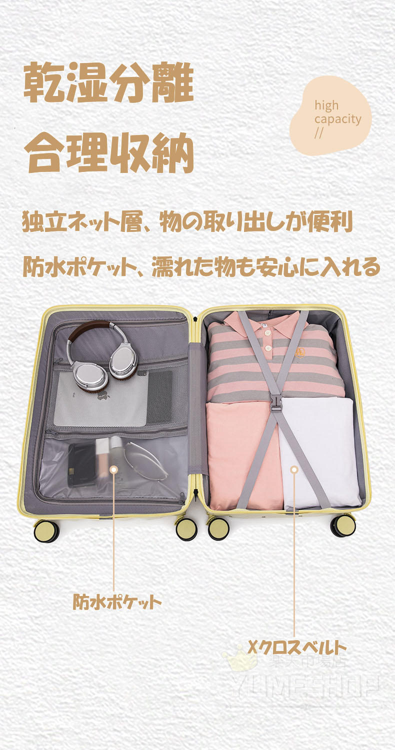【幅広いシーンで使えるシンプルなデザイン】軽量でありながら強度のあるスーツケース。シンプルでかわいいデザインになっており、男女を問わず、ご愛用いただけます。マジックテープを切り離し、フロントパネルをフルオープンにでき、荷造りも簡単。