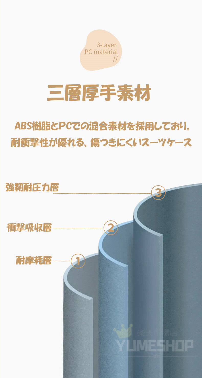 【丈夫かつ軽いPC ABS+PCボディ】スーツケースはABS樹脂とPCでの混合素材を採用しており、純ABS樹脂より耐衝撃性に優れています。エンボス加工、傷つきにくい。縦縞デザインにより、シンプルかつファッションです。