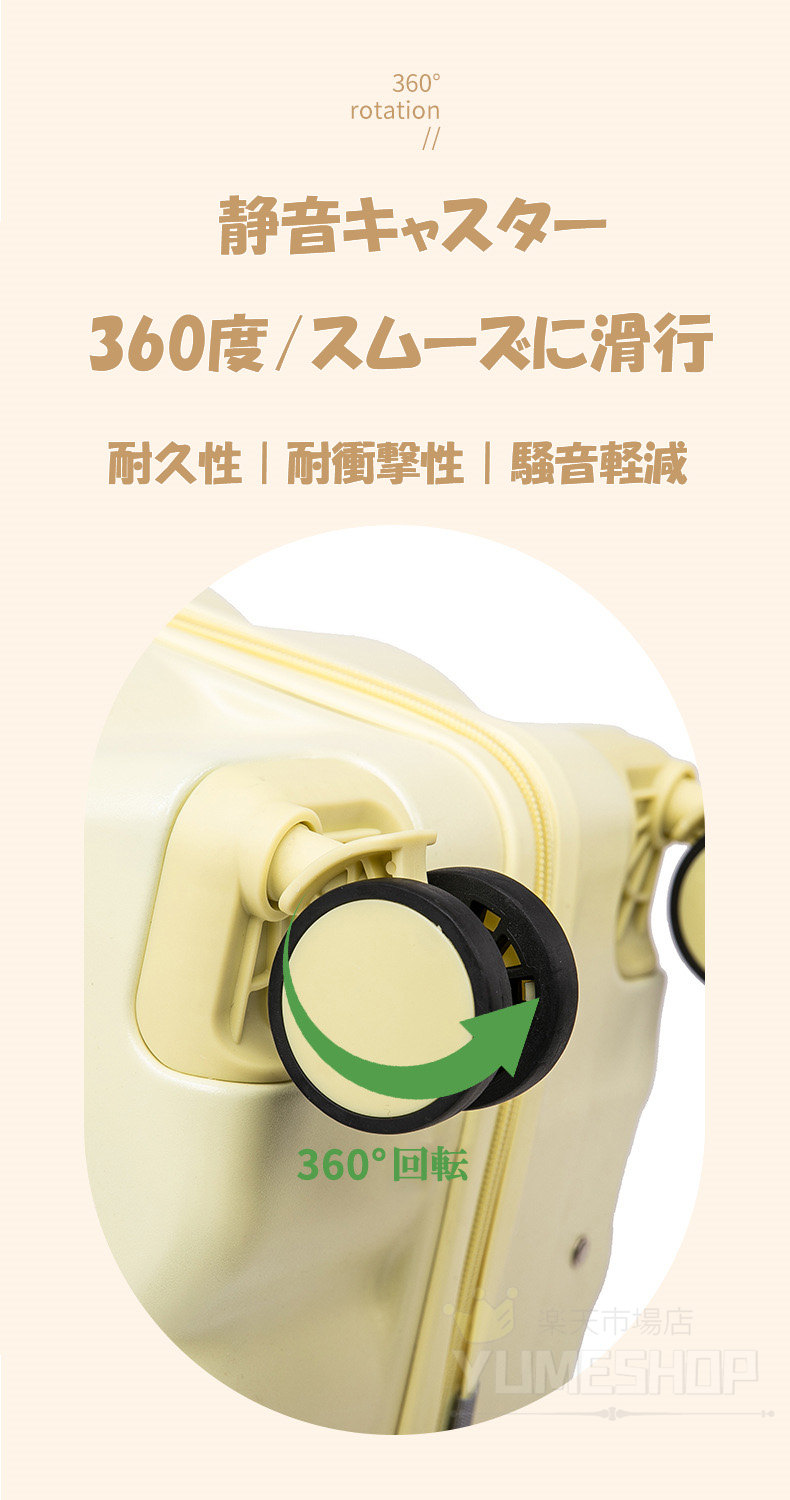【耐衝撃静音ダブルキャスター】高弾性のTPE衝撃軽減素材のキャスターを採用し、より静かで耐摩耗性も向上しています。スムーズか滑行を実現しながら、360度の自由回転もできます。