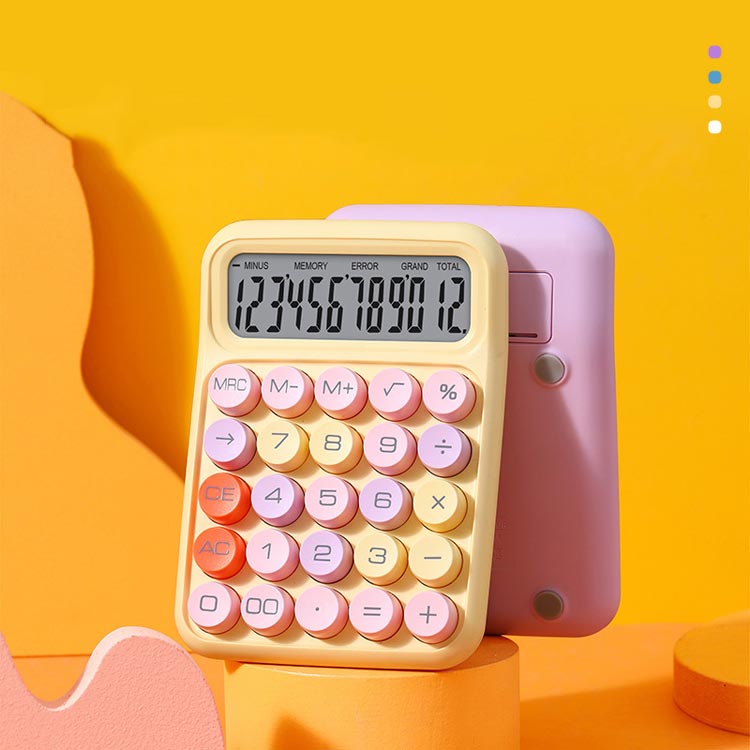 【かわいい美的電卓の特徴】シンプルで美しいデザインであり、明るい色と大きなレトロな丸い留め具が特徴です。