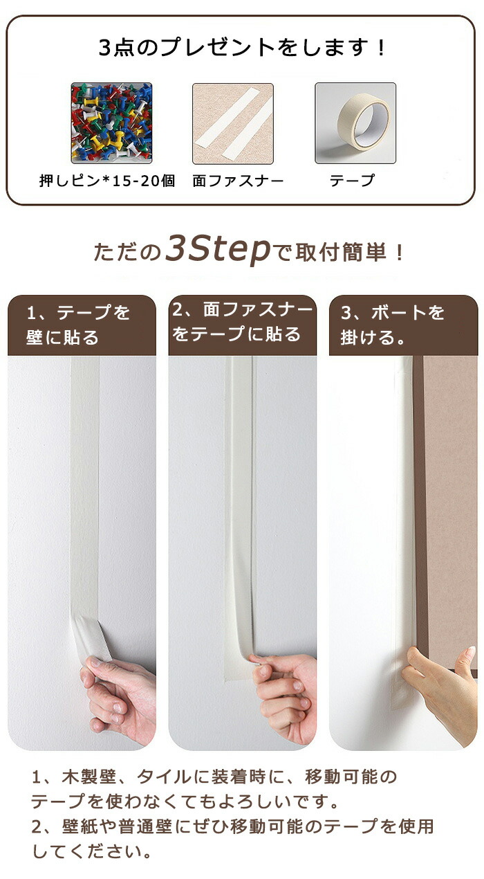 セット内容:ボード+面ファスナー+移動可能テープ+カラフル押しピンx15-20個+日本語取扱説明書