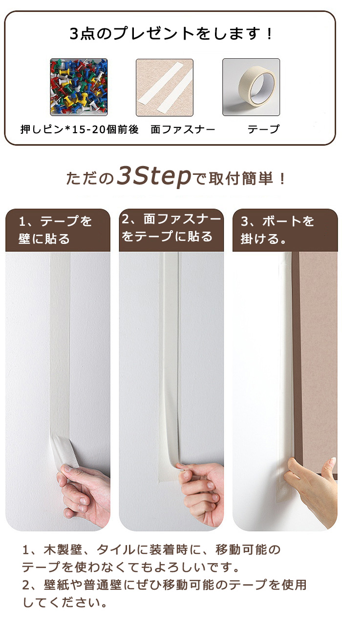 セット内容:ボード+面ファスナー+移動可能テープ+カラフル押しピンx15‐20個前後+日本語取扱説明書