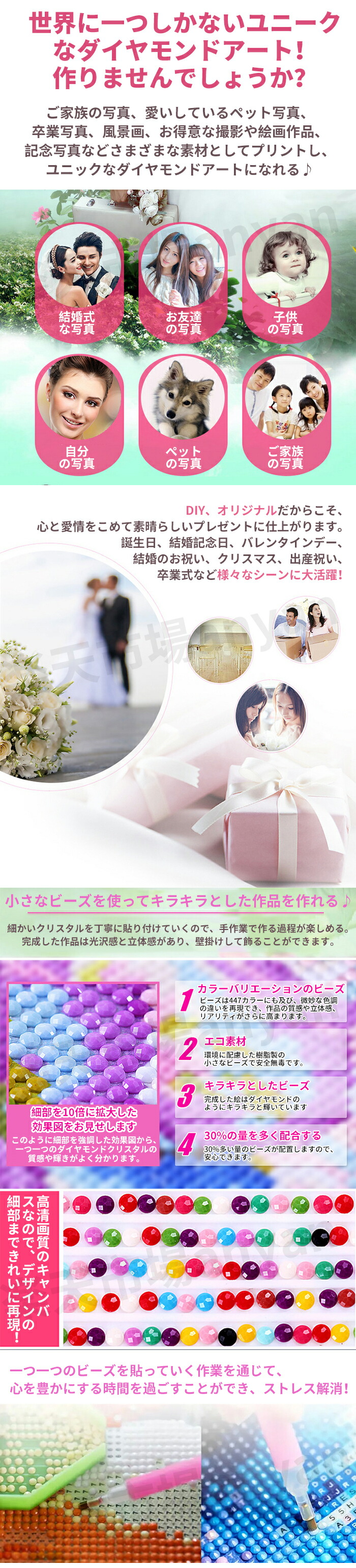 【世界に一つしかないユニークなダイヤモンドアート!】ご家族の写真、愛いしているペット写真、卒業写真、風景画、お得意な撮影や絵画作品、記念写真などさまざまな素材としてプリントし、ユニックなダイヤモンドアートになれる♪