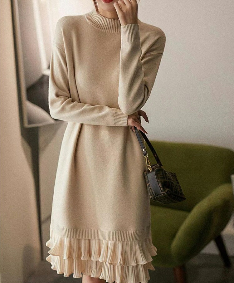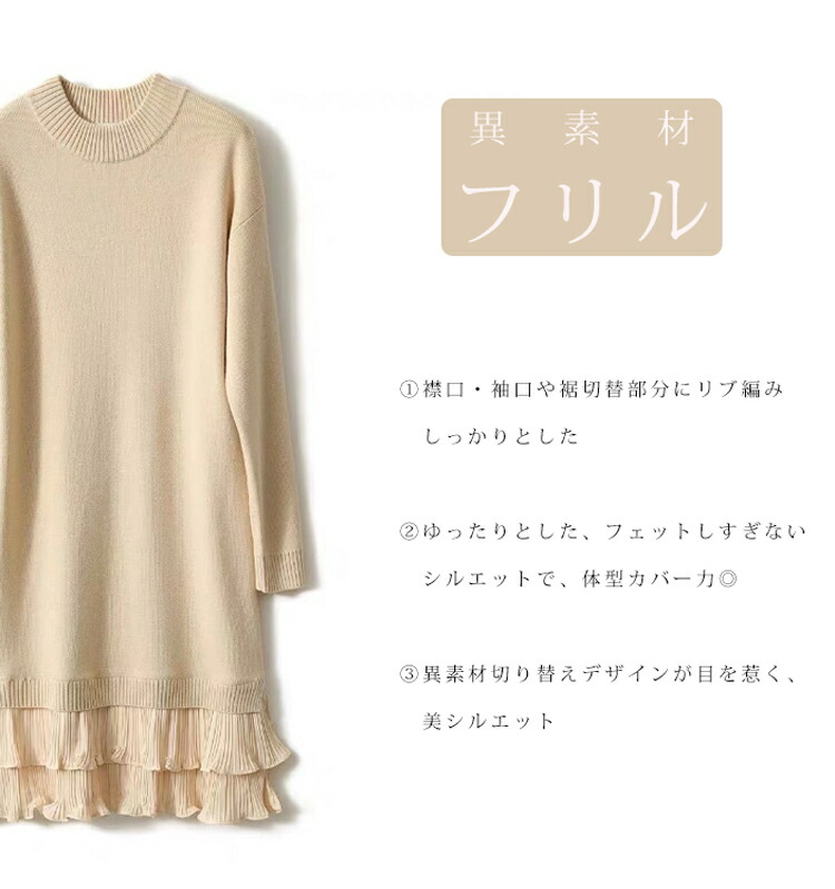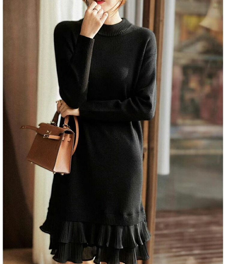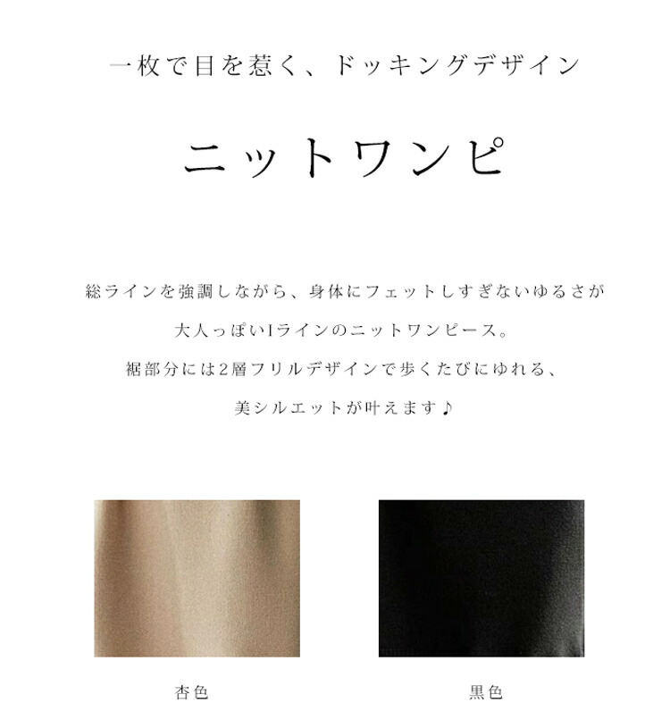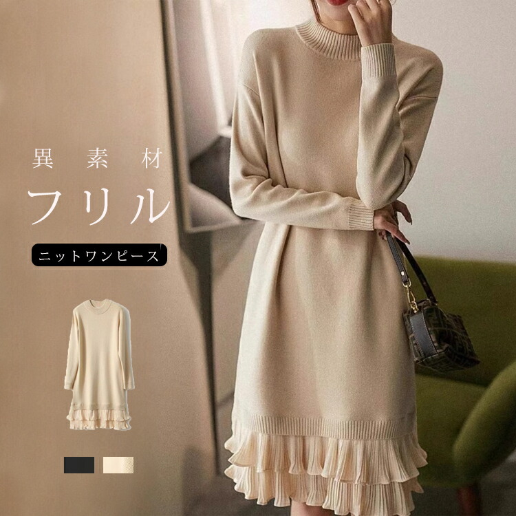 ニットワンピース 秋冬 フリル 切り替 レディースファッション 超目玉商品 黒色 杏色
