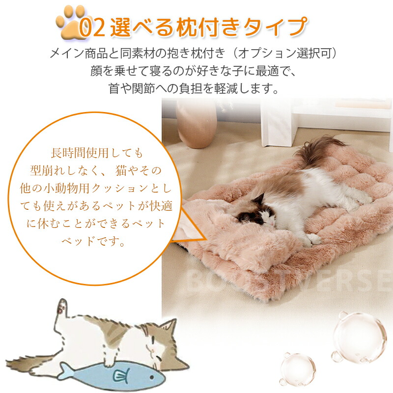 マットには柔らかい枕が付属。内部には吸湿速乾性に優れたPP棉を詰め込み、首と背骨を優しく支えます。ペットが顎を乗せて休むのにも最適。体圧を分散し、愛寵の健康を守ります。