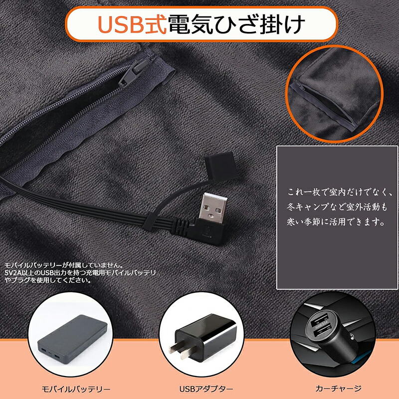 【安心安全なUSB給電式】この電気もうふはモバイルバッテリーなどの電源を使用して使えるのUSB給電式、5 V/2 Aの低電圧給電は電源コネクター給電より安全性が高いです。電気もうふの裏面の収納ポケットがあり、USBケーブルとモバイルバッテリーと接続してポケットに収納して便利です。使用状況に合わせてモバイルバッテリーの使用可能時間は10000mAHで最大6時間、20000mAh 最大12時間が目安となります。(※5V、2.1A以上必須。お使いいただくモバイルバッテリーの容量によって、使用可能時間は異なります。