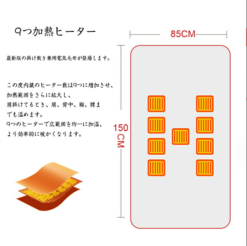 【最新9つ加熱ユニット、掛け敷き兼用電気毛布】2023年最新版の掛け敷き兼用電気毛布が登場します。この度内蔵のヒーター数は9つに増加させ、加熱範囲をさらに拡大し、肩掛けてるとき、肩、背中、胸、腰までも温めます。9つのヒーターで広範囲を均一に加温、より効率的に暖かくなります。従来品の大きくないサイズより、今回電気毛布は160x100cm大判サイズに調整させ、肩掛けだけでなく、ひざ掛け、腰に巻く、ソファー、ベッドに敷きなど場合もサイズが適合して使用できます。これ一枚で室内だけでなく、冬キャンプなど室外活動も寒い季節に活用できます。 "