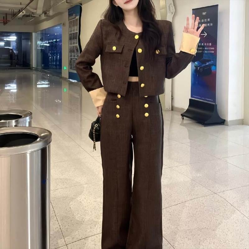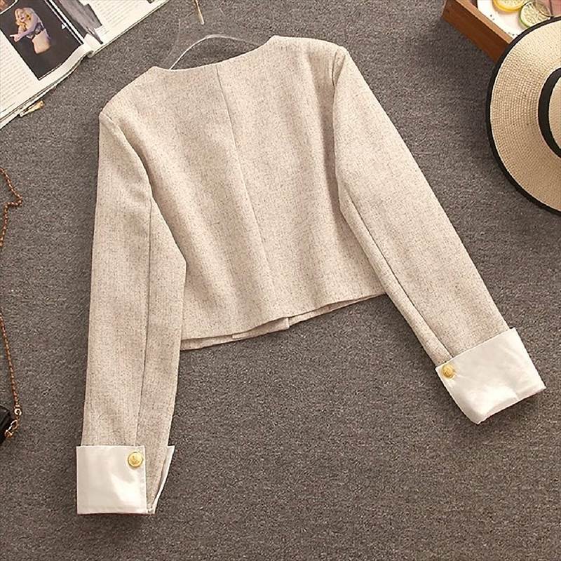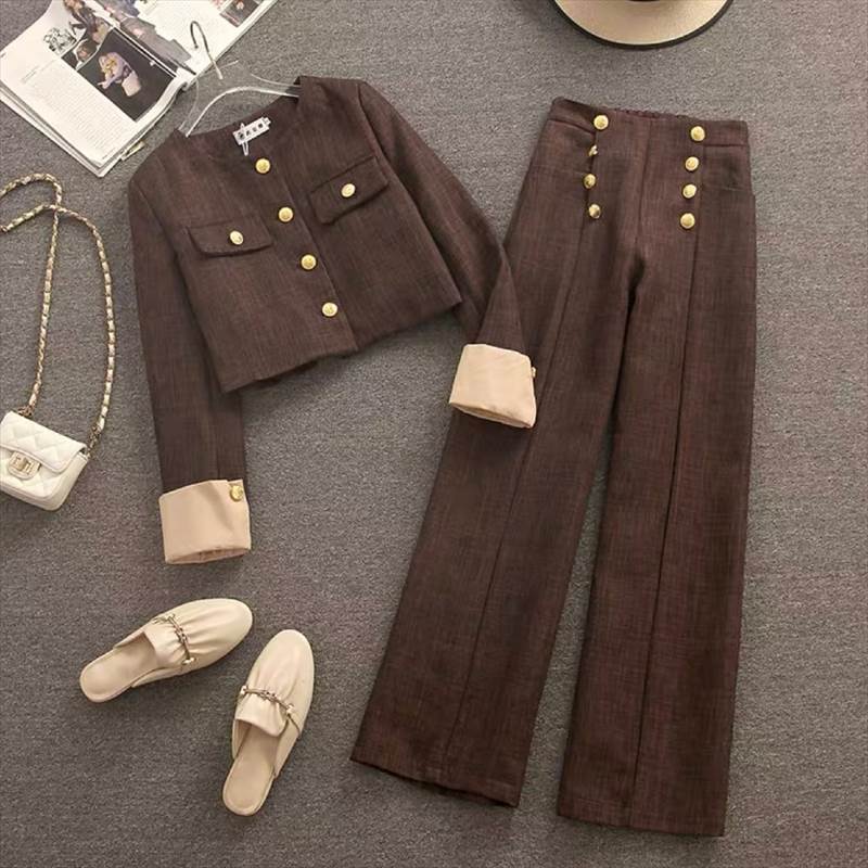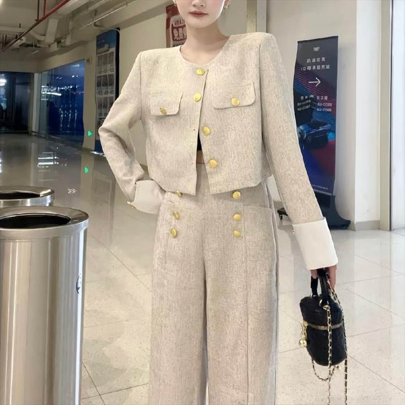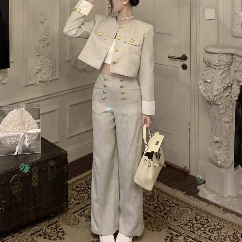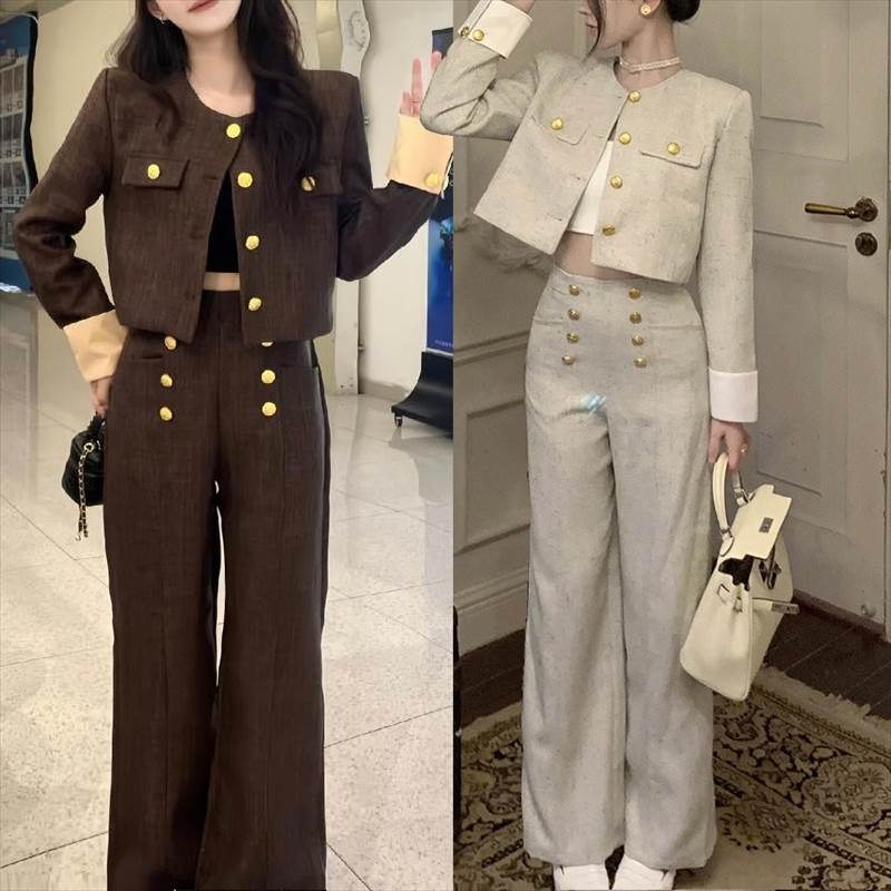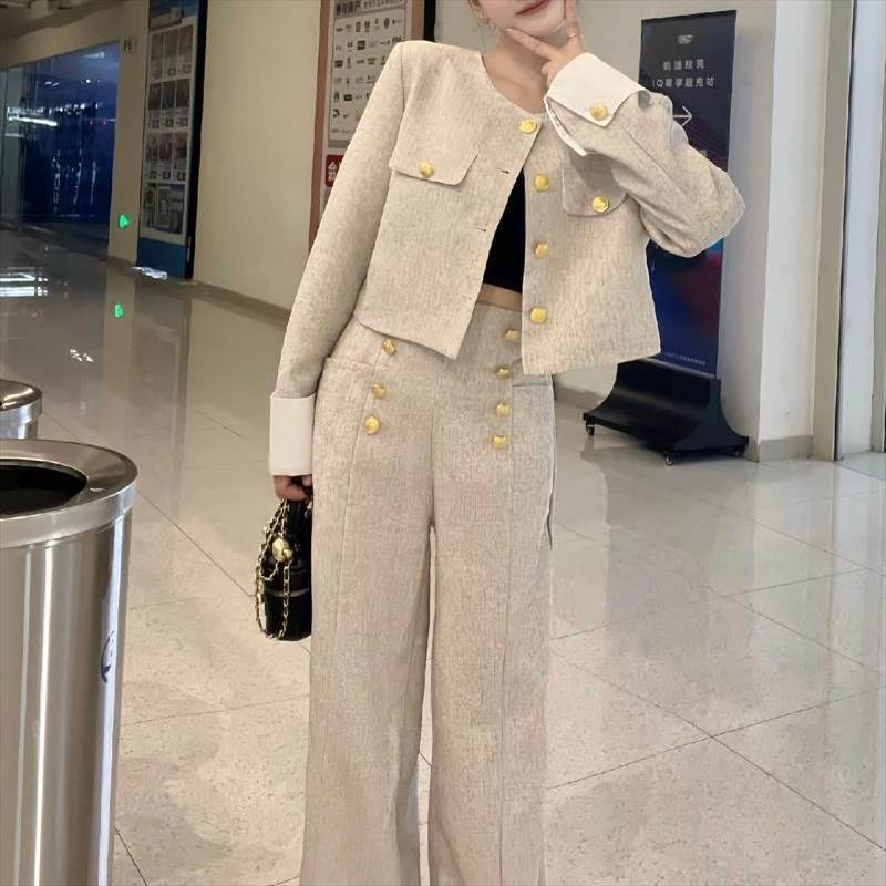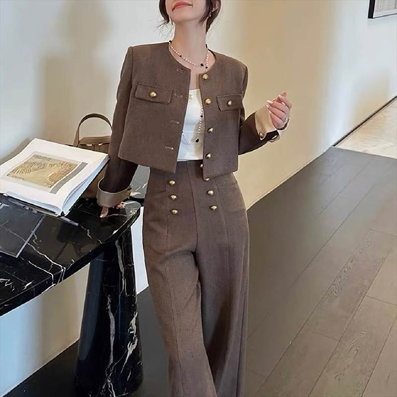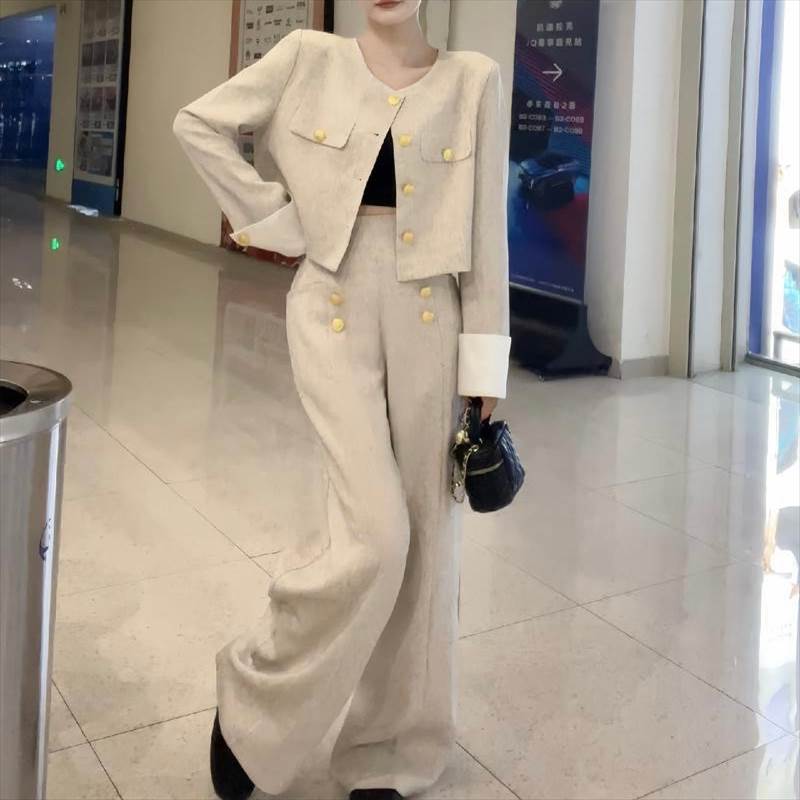 2カラー レディースセットアップ ジャケット&ロングパンツ ショート 長袖 ノーカラー ストレート おしゃれ ガーリー エレガント フォーマル 無地 シーズンレス オフィス ビジネス イベント ショッピング コンサート カフェ 上品 韓国 ミニ ミニ丈 ショート丈 上品 セクシー 2点セット ハイウエスト アウター フレア ワイド