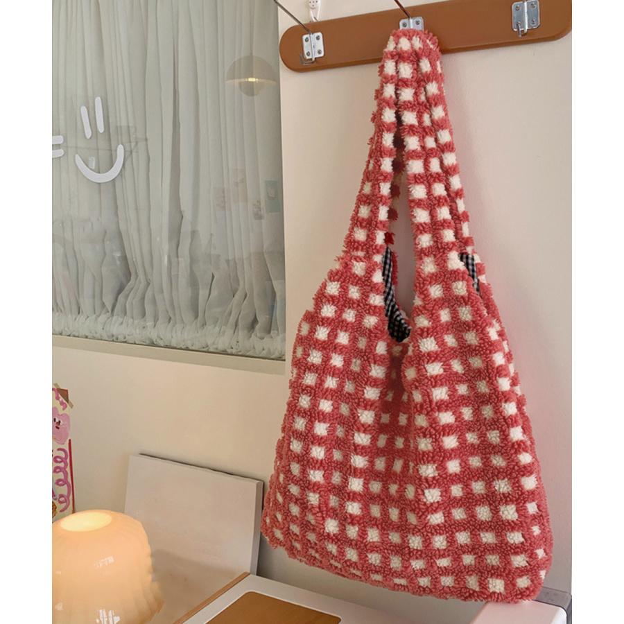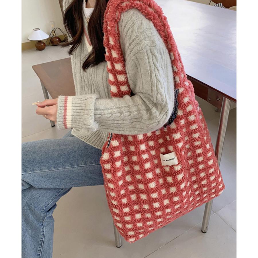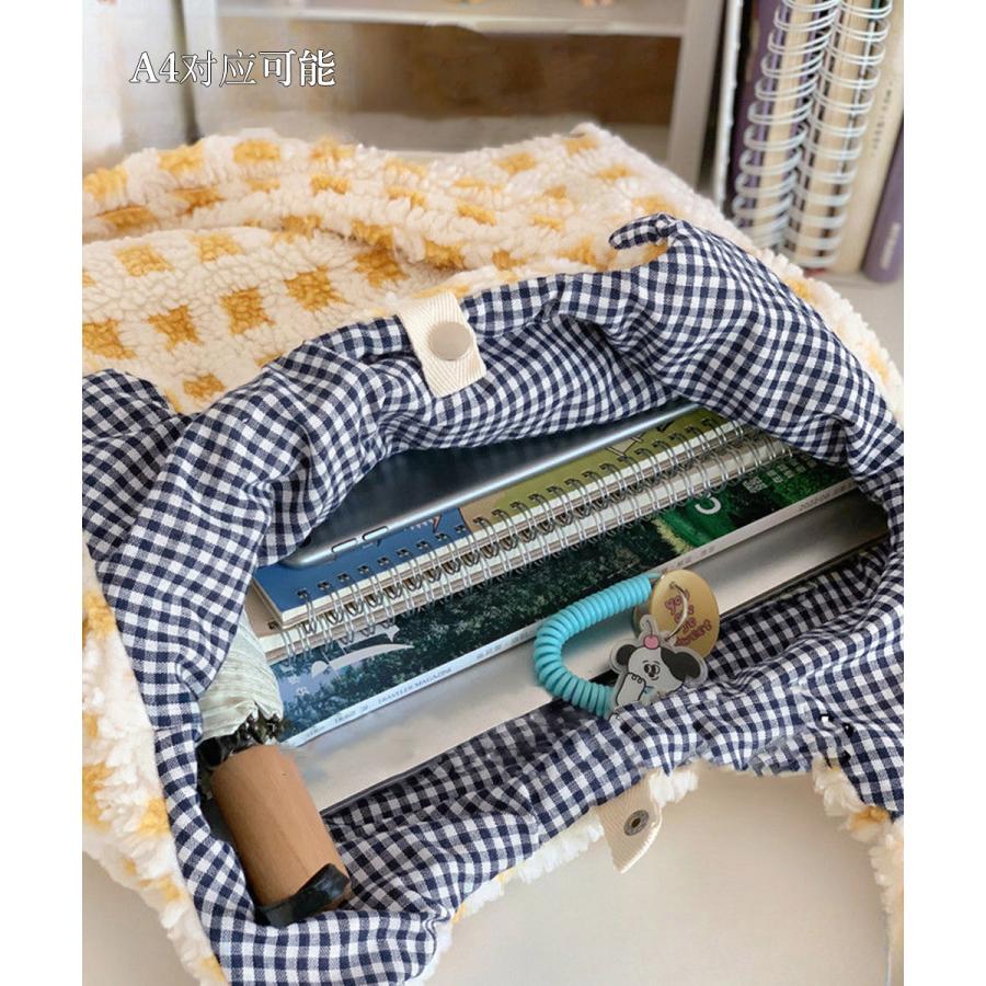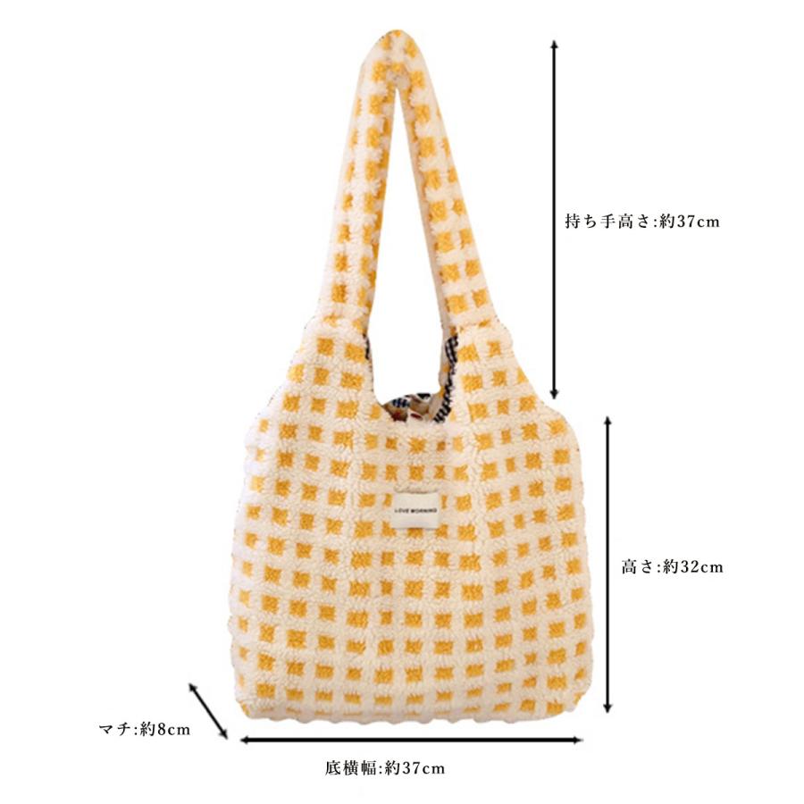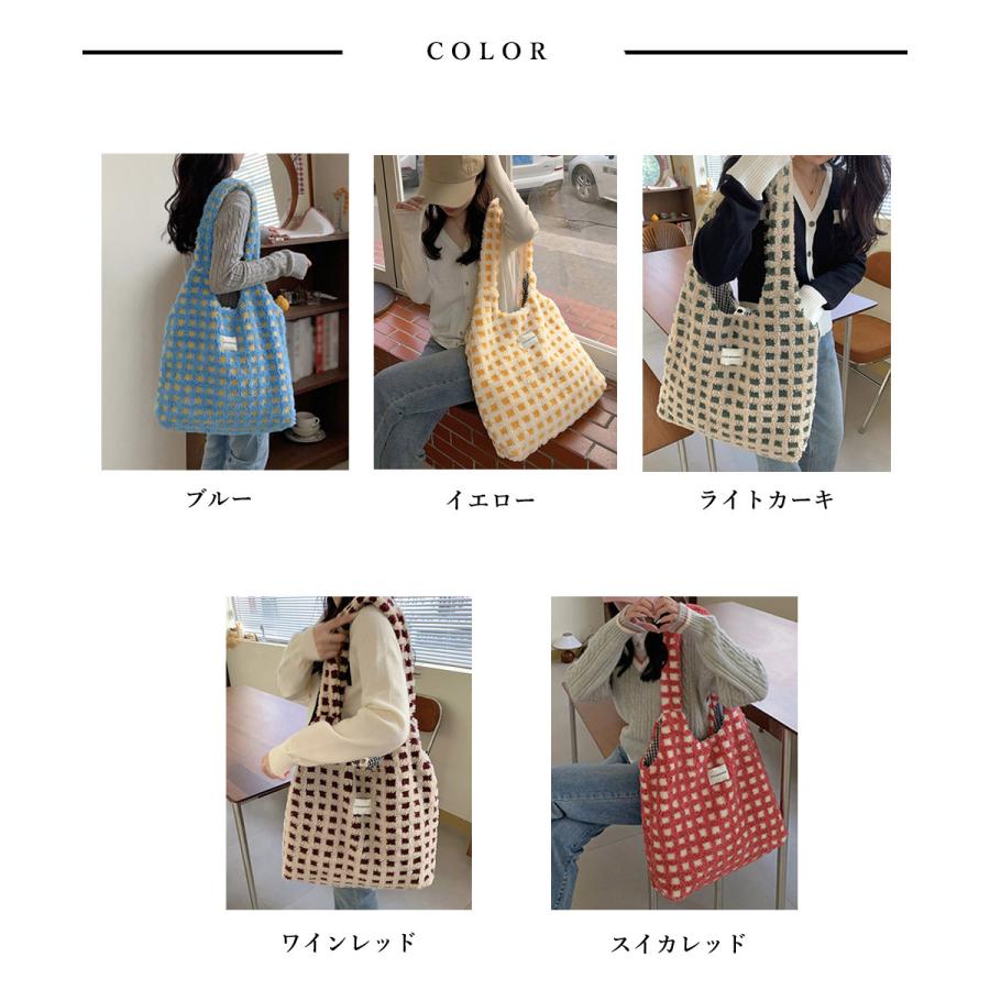 ボアトートバッグ チェック柄 大容量ク バッグ 小物 ブランド雑貨 続々登場 ブルー ライトカーキ スイカレッド ワインレッド イエロー