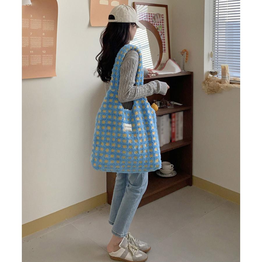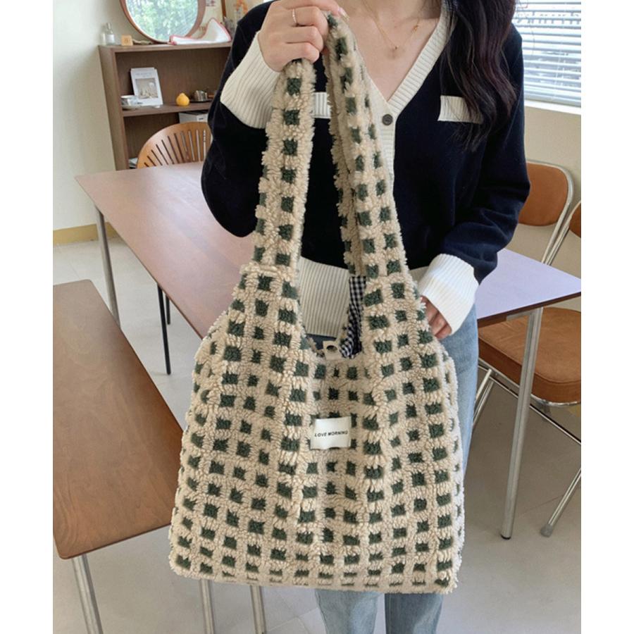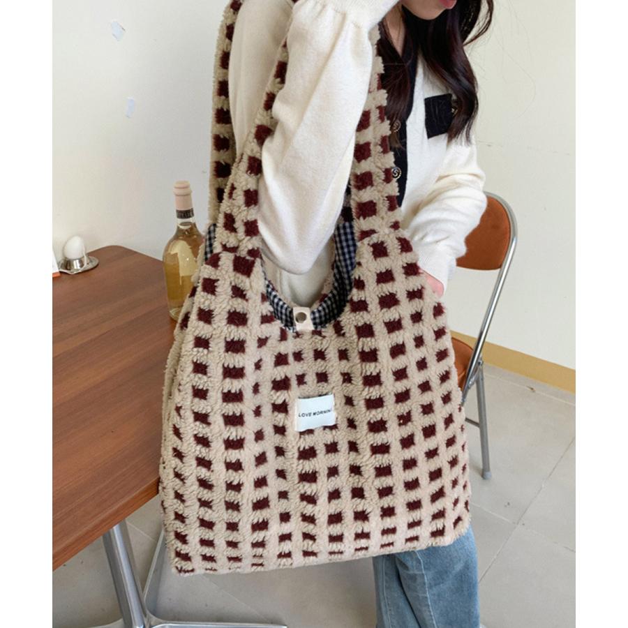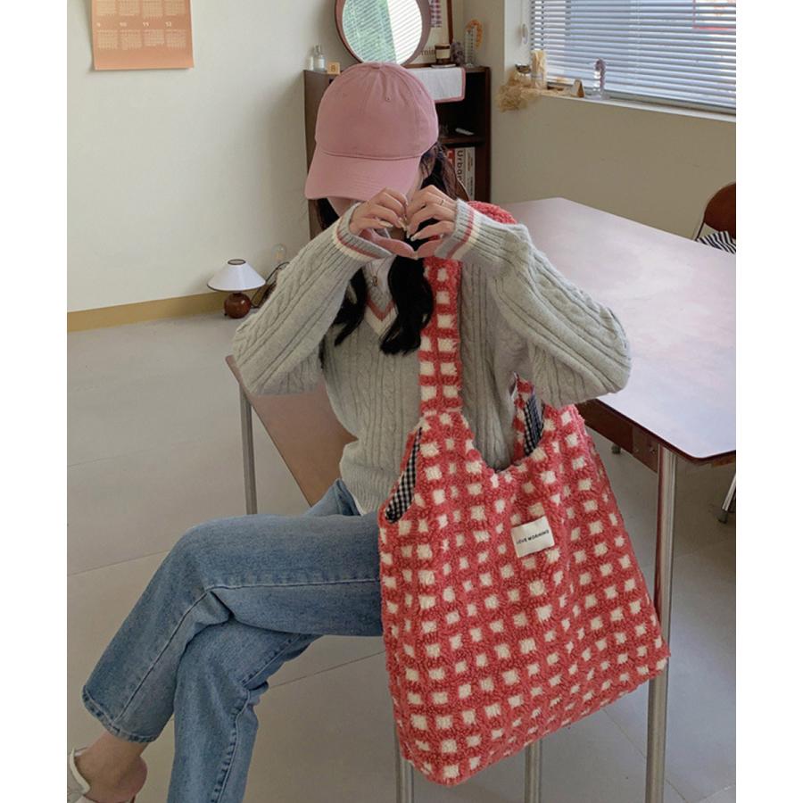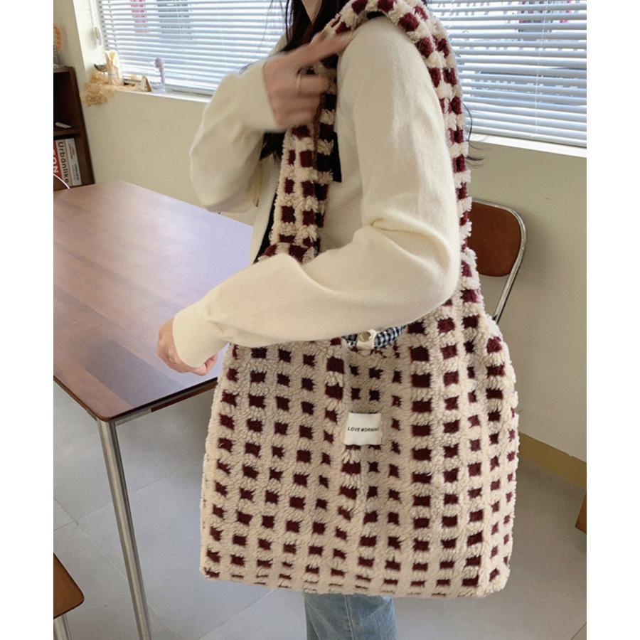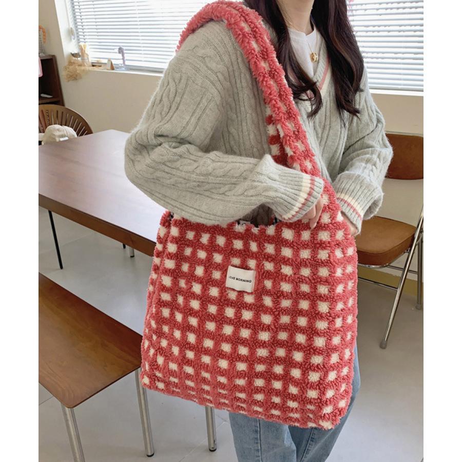 ボアトートバッグ チェック柄 大容量ク バッグ 小物 ブランド雑貨 続々登場 ブルー ライトカーキ スイカレッド ワインレッド イエロー