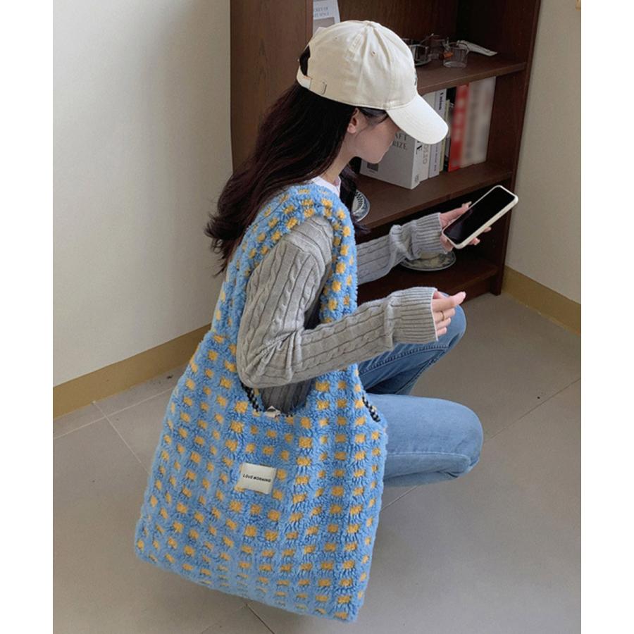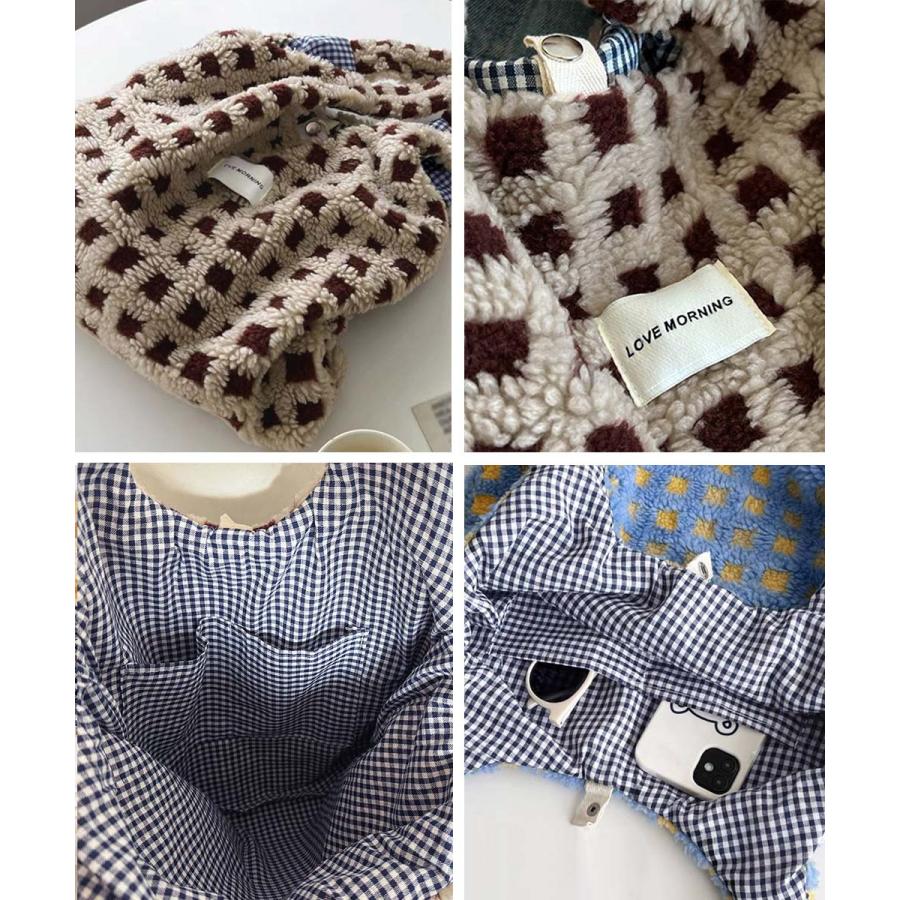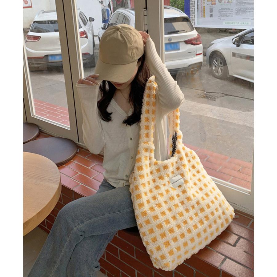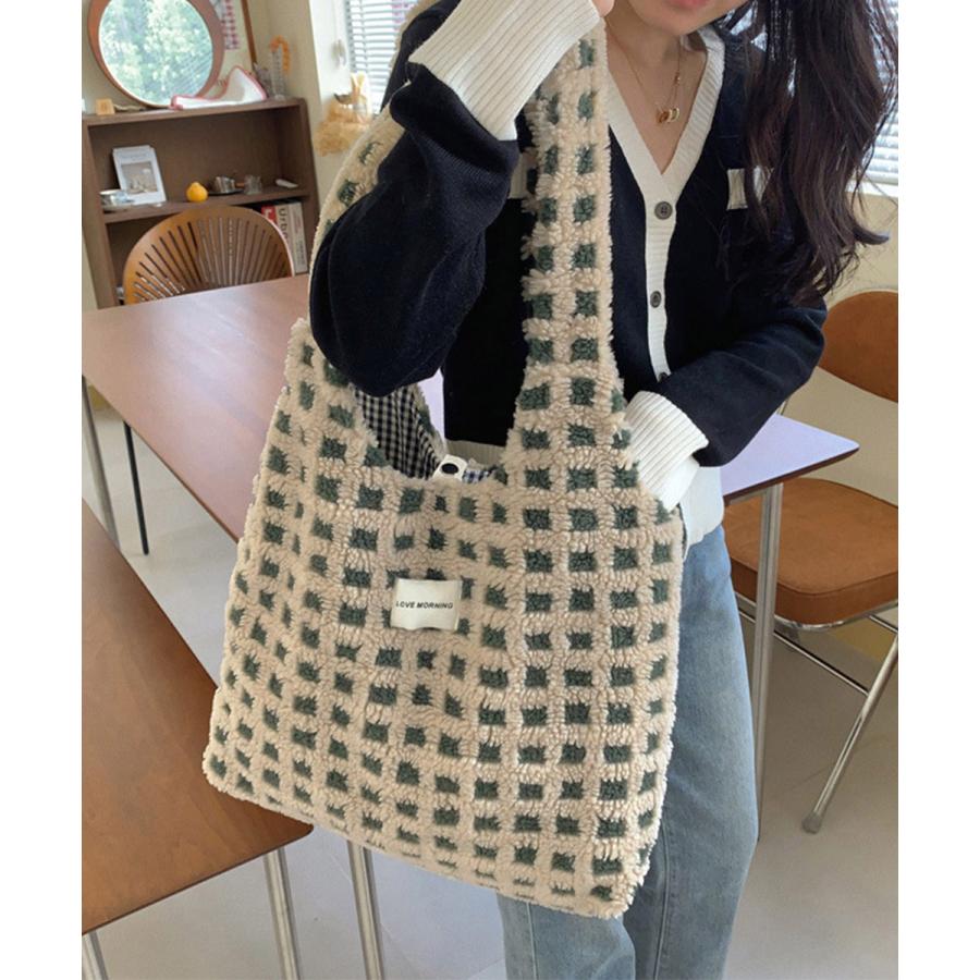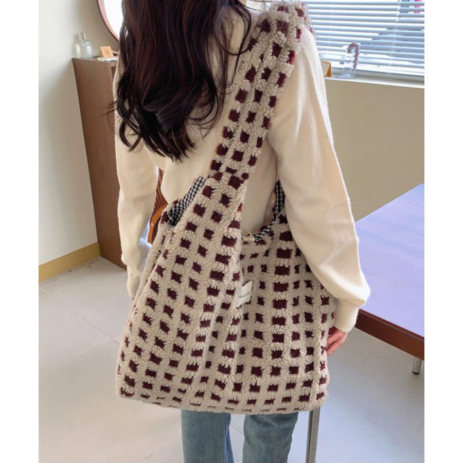 ボアトートバッグ チェック柄 大容量ク バッグ 小物 ブランド雑貨 続々登場 ブルー ライトカーキ スイカレッド ワインレッド イエロー