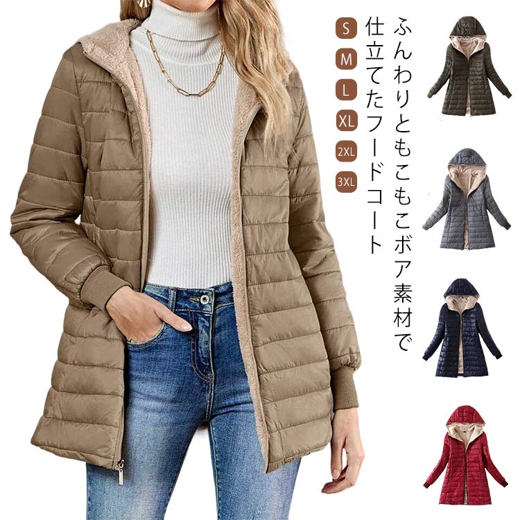 キルティングコート 裏起毛 レディース キルティングジャケット アウター フード付き 裏ボア コート ロングコート ミドル丈 暖かい 秋冬服 体型カバー