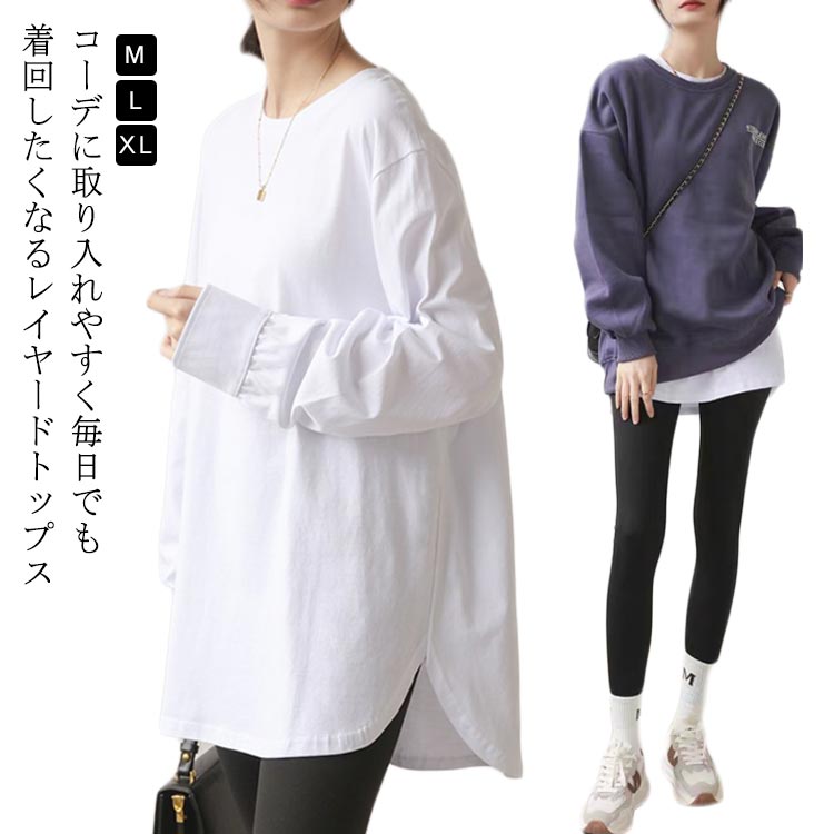 レイヤード Tシャツ 長袖 クルーネック 綿 コットン レディース トップス tシャツ カットソー ロンt きれいめ ラウンドヘム 重ね着 インナー 白T ロングTシャツ シンプル