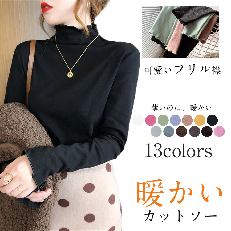 フリル カットソー ハイネック インナー レディース 秋冬 微起毛 トップス フリルネック ハイネックインナー 長袖 タートルネック ストレッチ 伸びる インナートップス きれいめ 長袖tシャ 柔らか