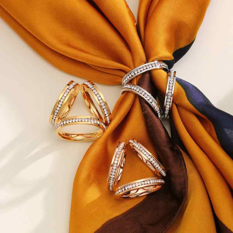 スカーフリング マフラーリング レディース 女性用 高級感 上品 エレガント ステンレス チタン鋼製 炉内真金電気メッキ加工 手作業 フルラインストーン ジルコニア 円形 シルバー ローズ 三連リング