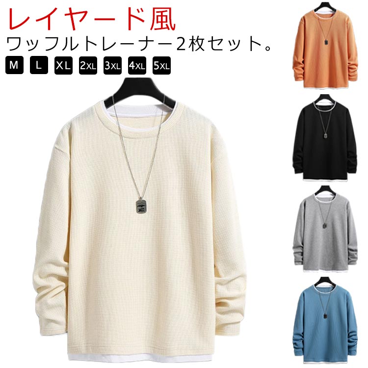 長袖 重ね着風 Tシャツ レイヤード風 おしゃれ プルオーバー メンズ レイヤード ワッフル トップス カットソー クールネック ドロップショルダー ゆったり 無地 冬 ルームウェア カ 秋